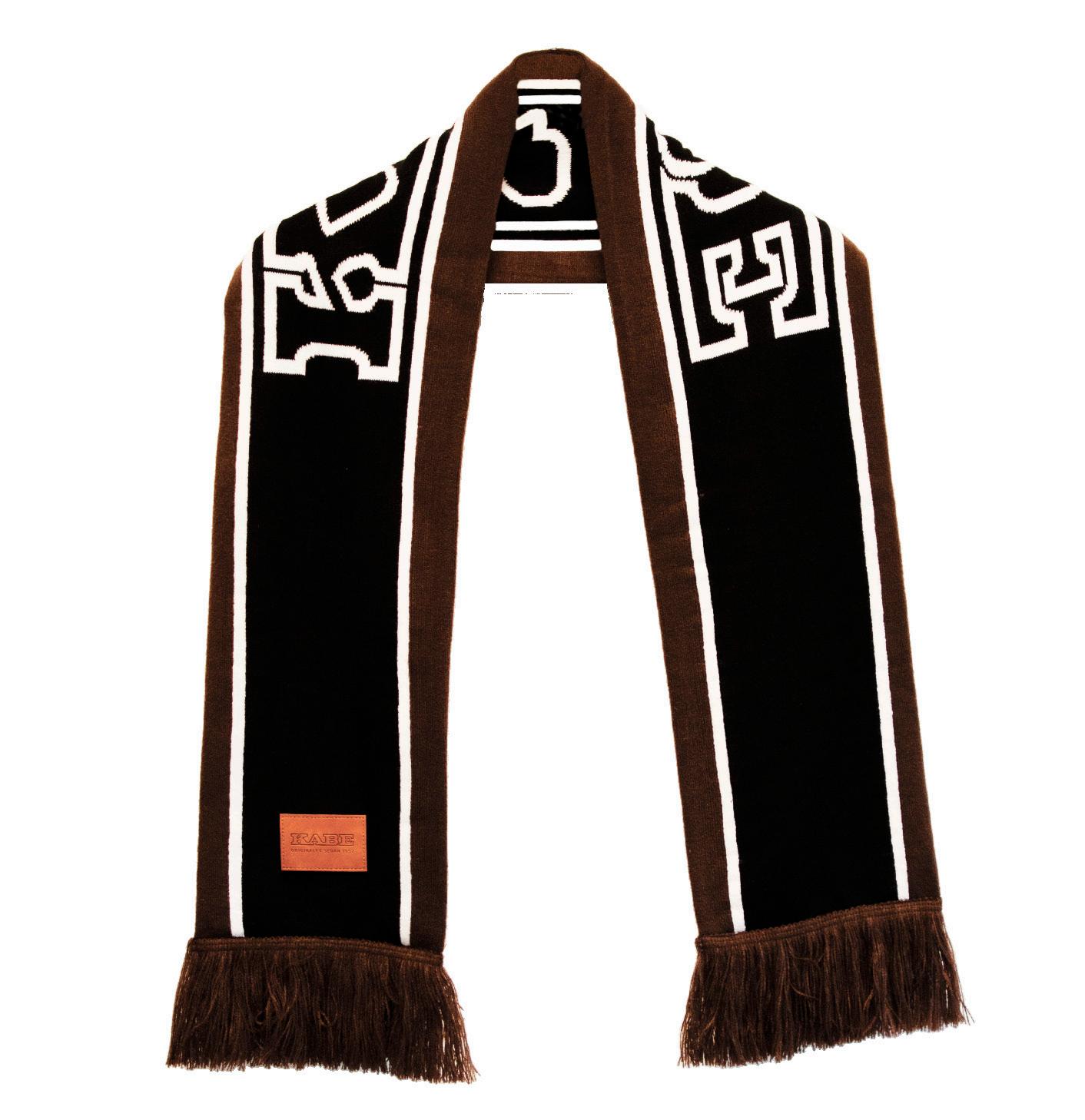 Spezialgefertigter Schal, passend zur Mütze mit eingewebtem Motiv und Lederpatch.