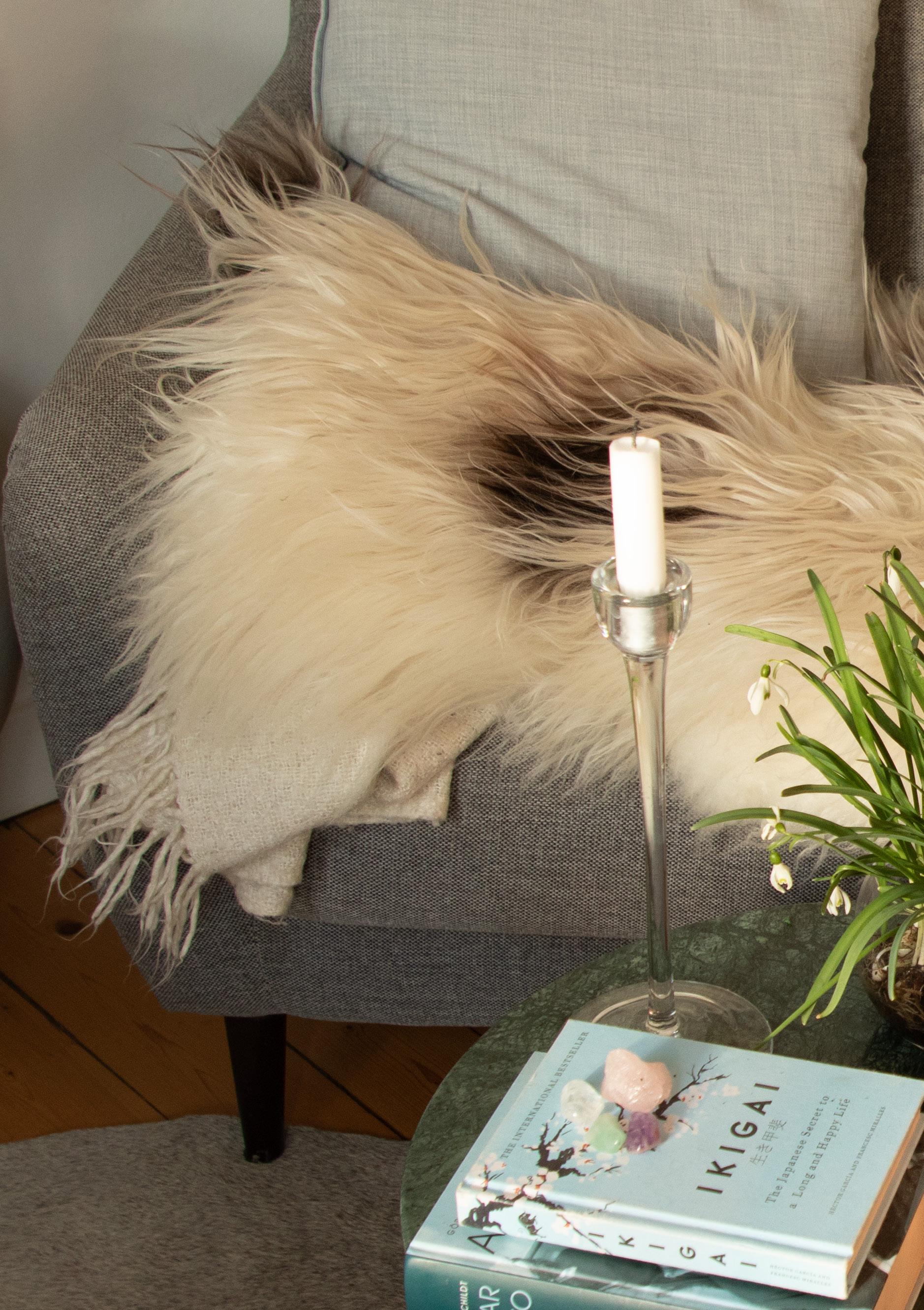 Probeer je te omringen met schoon textiel en natuurlijke materialen zoals leer, wol en katoen. Schapenvacht verwarmt effectief zonder benauwd te worden, omdat schapenvacht een uniek natuurlijk karakter en ademende eigenschappen heeft. Verhoog de gezelligheidsfactor met de vlam van de ventilatorkachel.