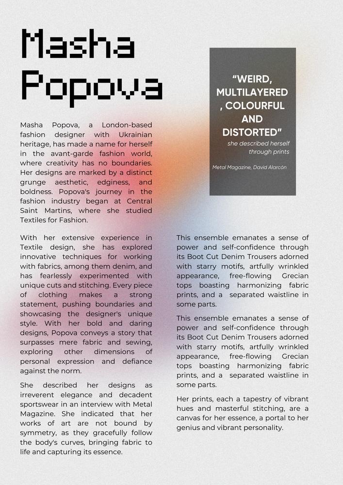 The first edition design incorporates genuine Masha popova’s brand photoshoots, which we were not permitted to utilise due to copyright issues; hence, I turned to plan B AGAIN and replaced the picture with the closest vibe to the avant-guard design of Masha Popova brand's identity.