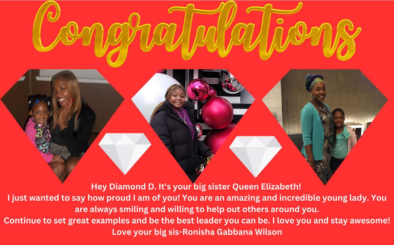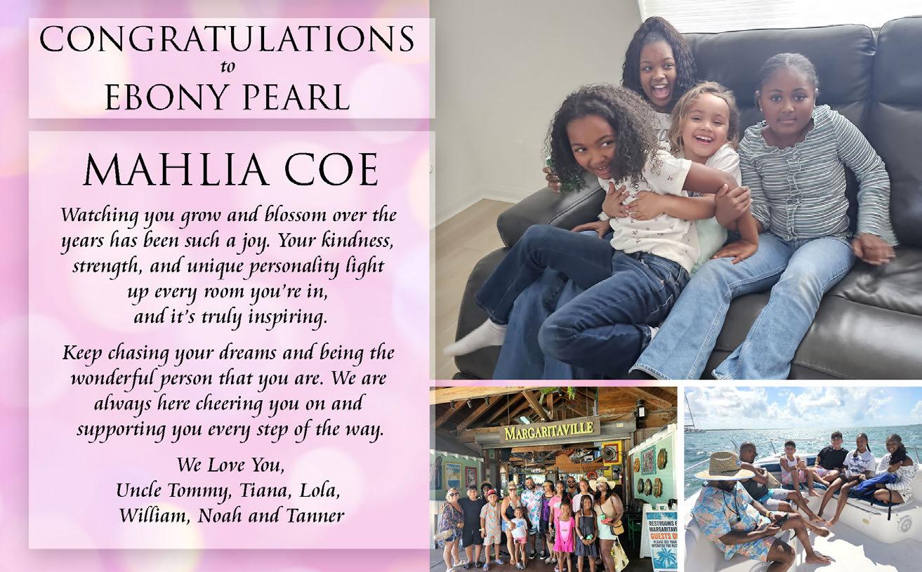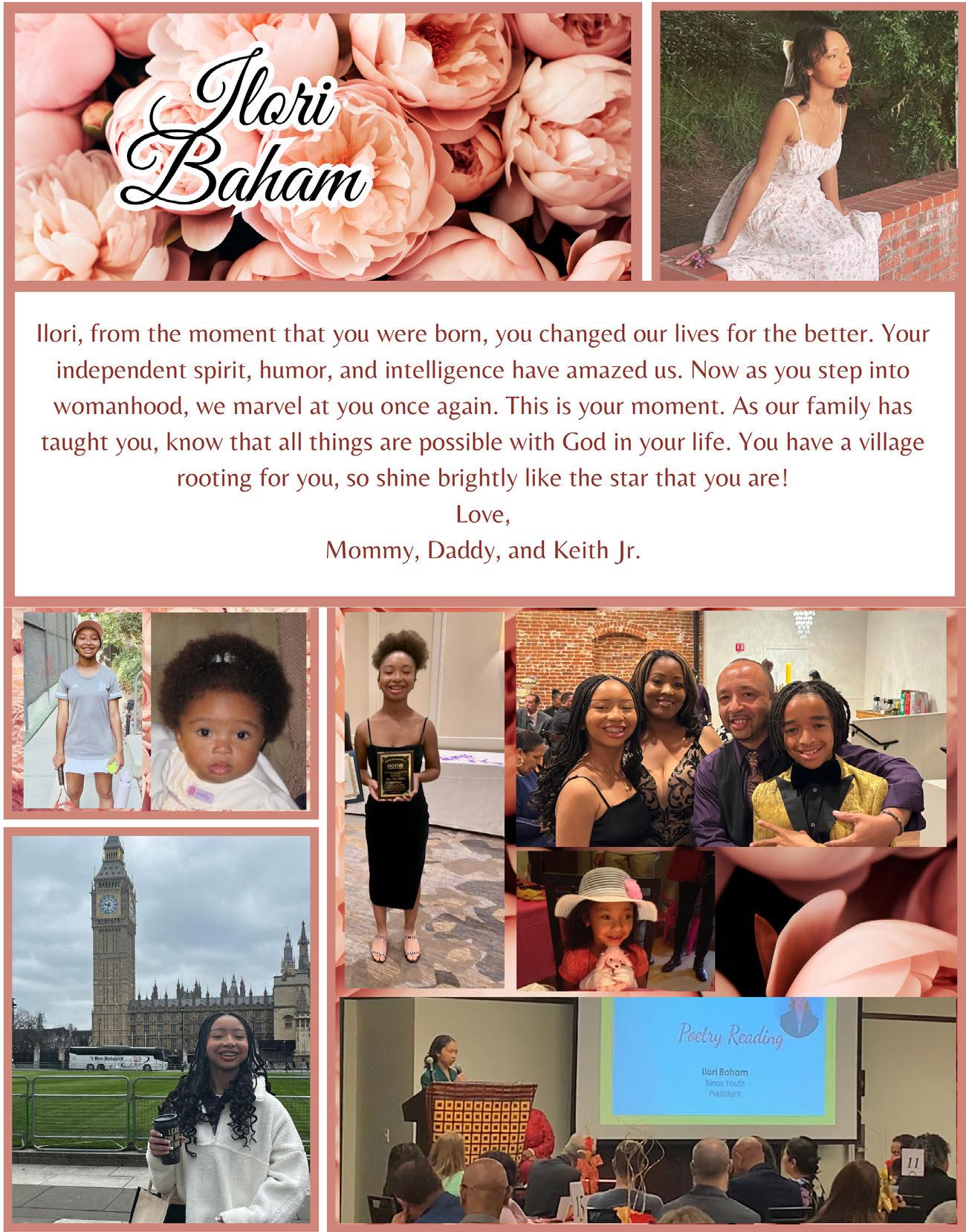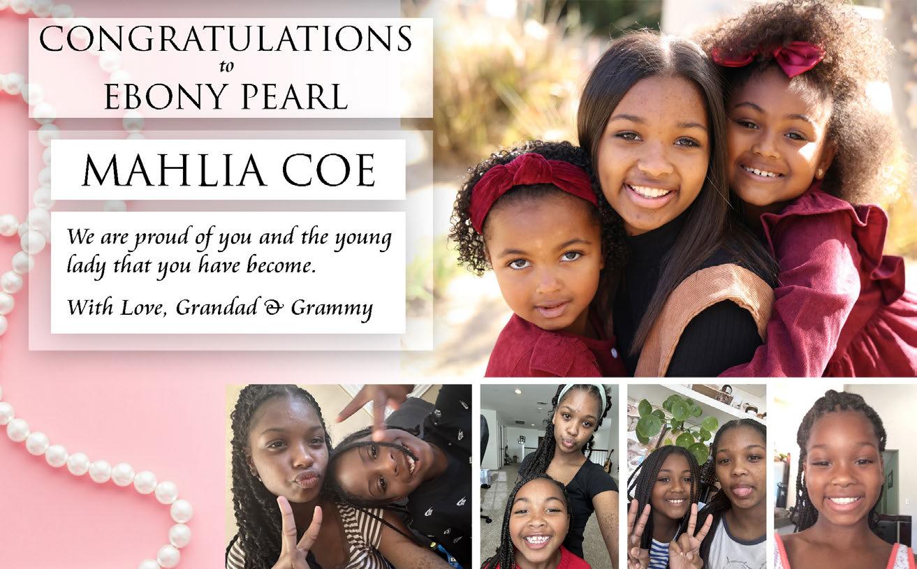 As your godmother, I have watched you grow from a precocious baby who had everyone wrapped around her finger to the young woman actively involved in her family, church, and community. You are truly a blessing to me and the family as Yaya’s Baby, Mommy’s Mini-Me, and Forever will be Fish for Grandma Megofna. I am so proud of you and your accomplishments, especially becoming an Ebony Pearl.