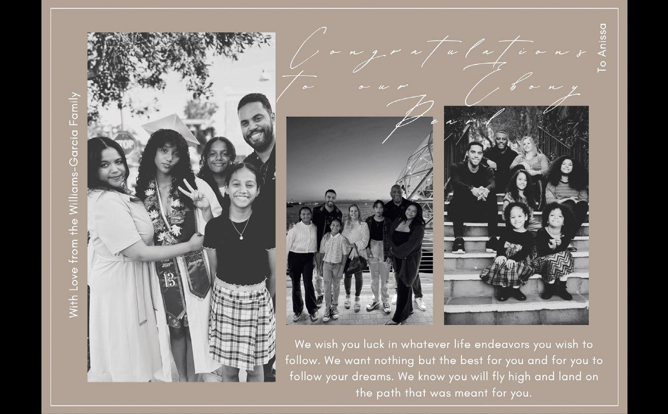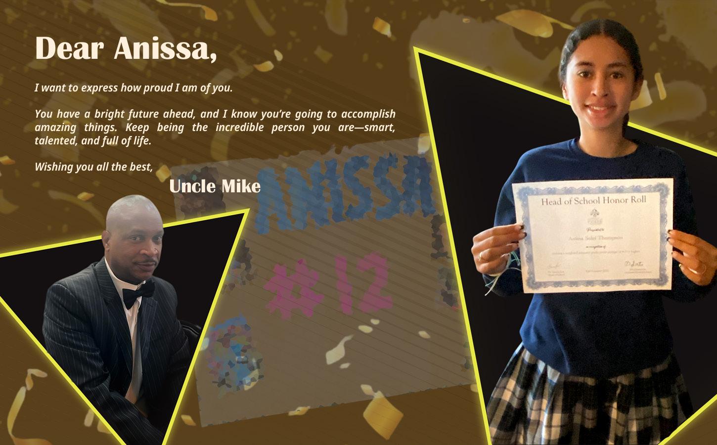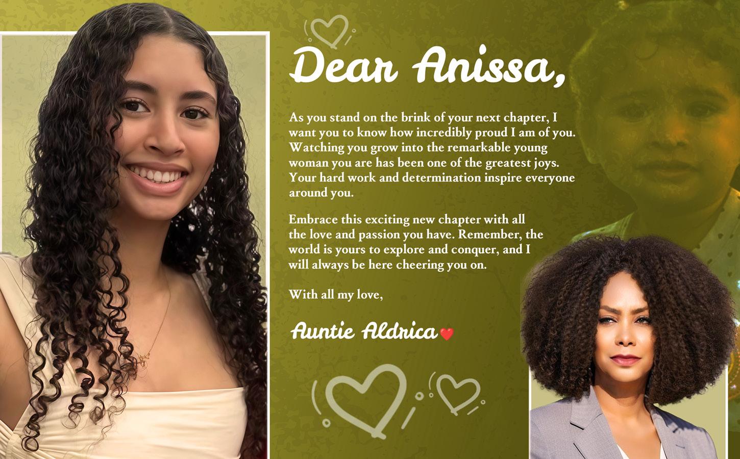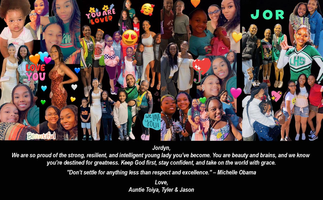 From the moment we knew you were coming, you have brought us excitement and a joy without end. We are so proud of you and all that you have accomplished. You have a way of bringing a smile to our hearts with your actions and with your words. You always bring laughter to any environment with your sense of humor. Thank you for being a delightful young lady. As for your academics, I have not seen someone wo time. You’ll always go the extra mile and put in the extra effort. I am thrilled to see you engage in ways that you do in school. It is hard to believe that your senior year is finally here. You’ve managed to stick through with all of your commitments such as band, sports and the different clubs and organizations that you belong to you have managed, and you are doing well a life is coming to an end.