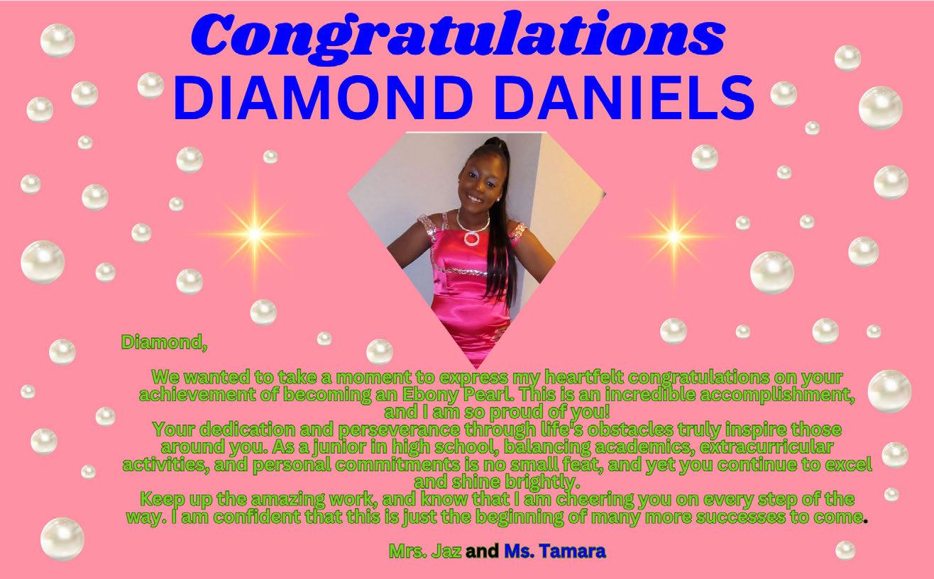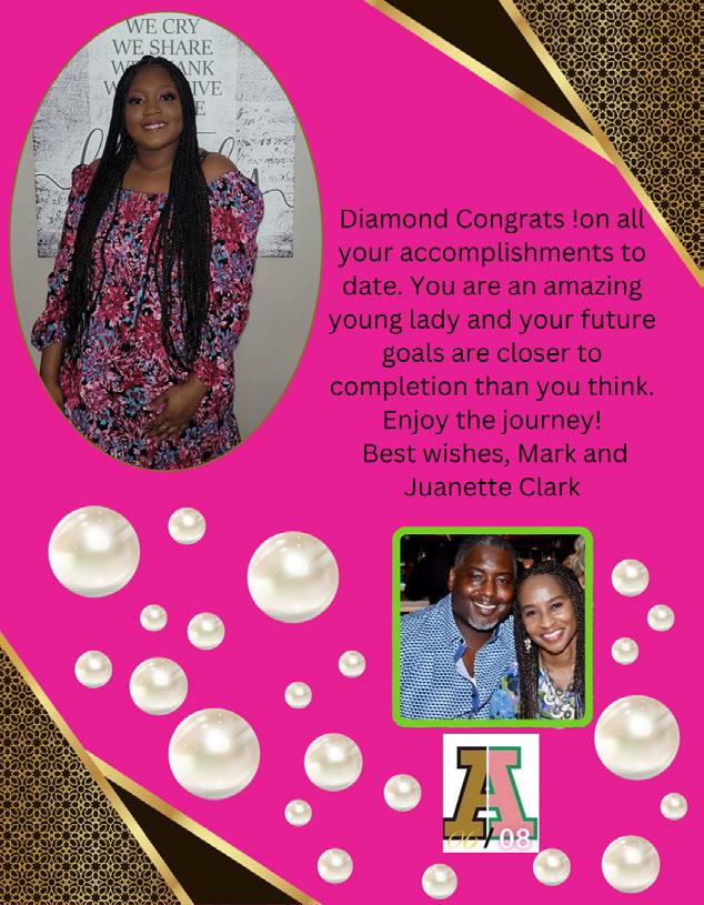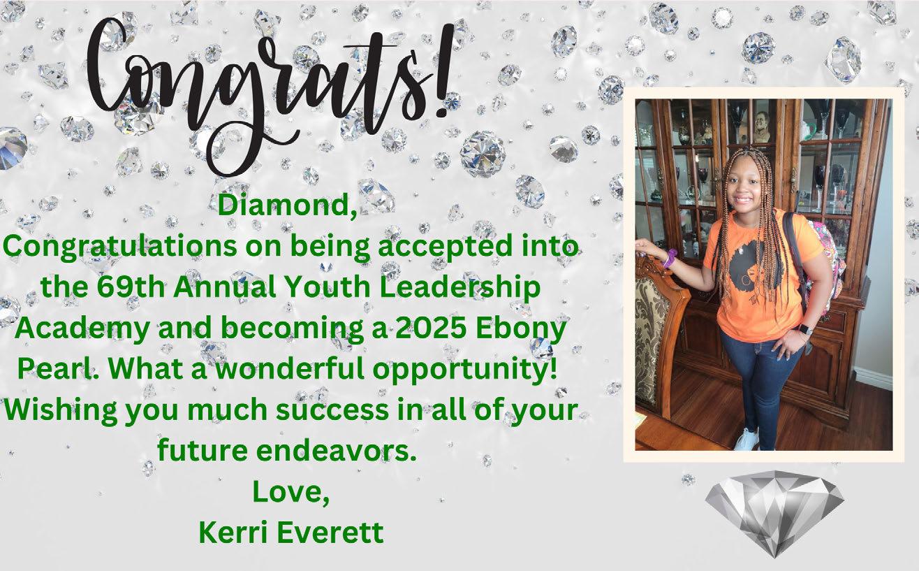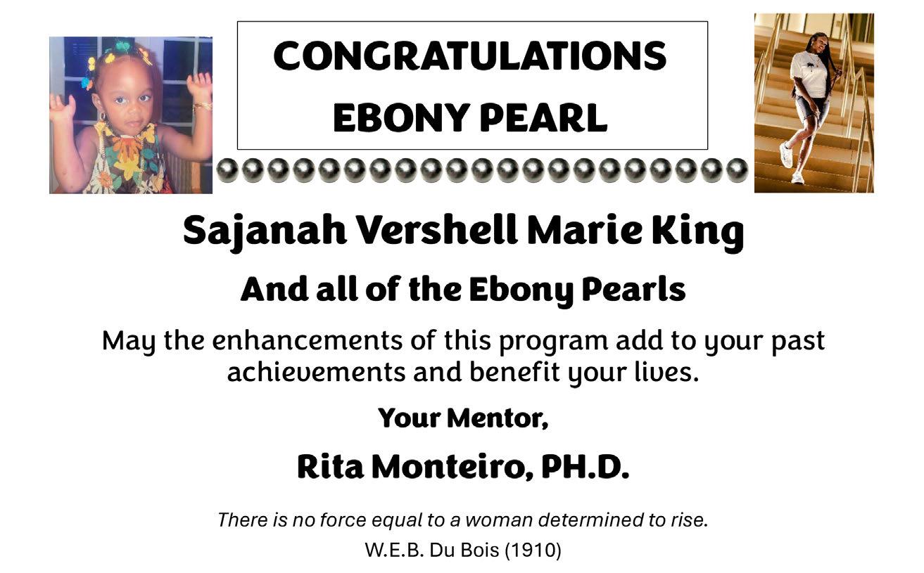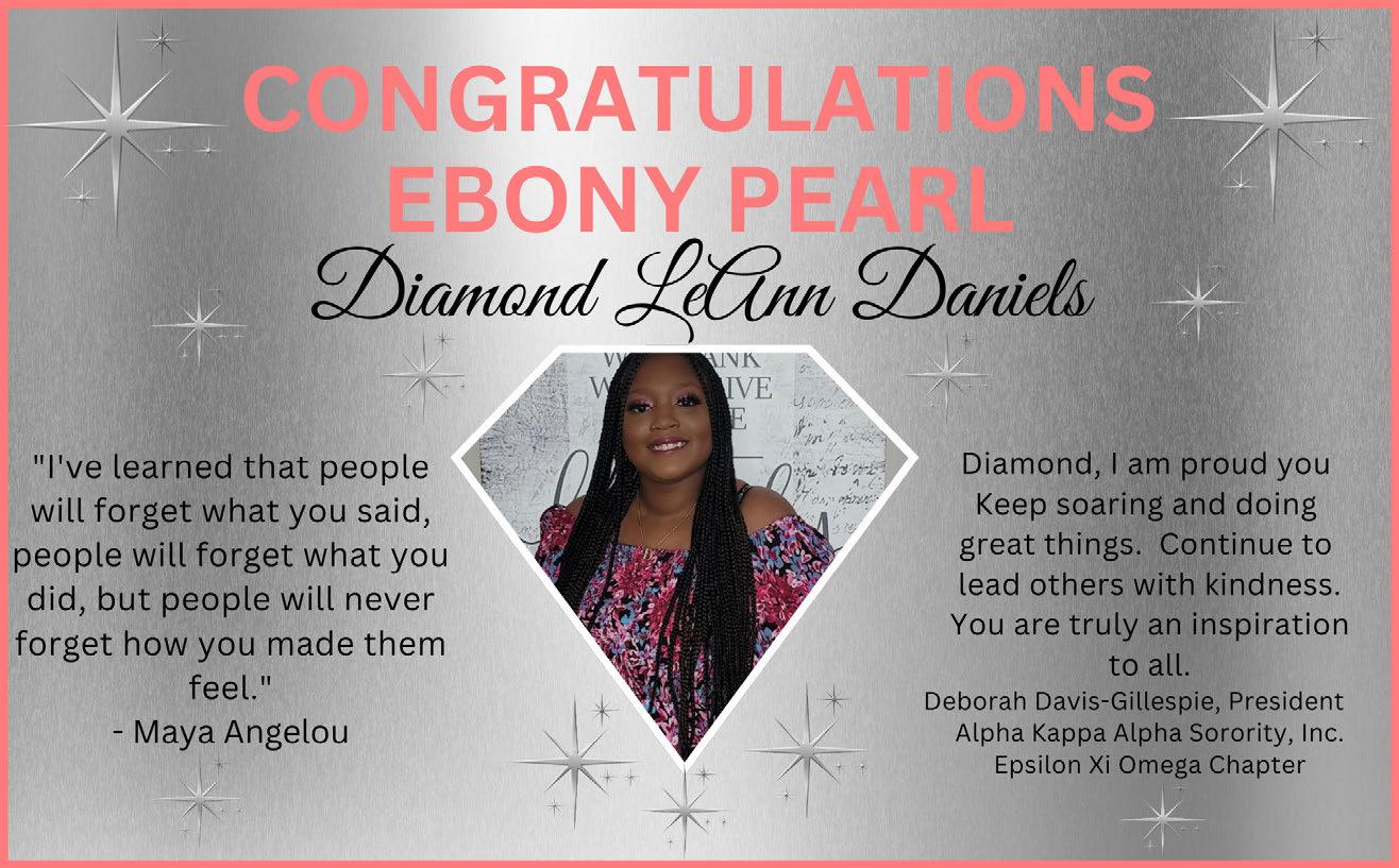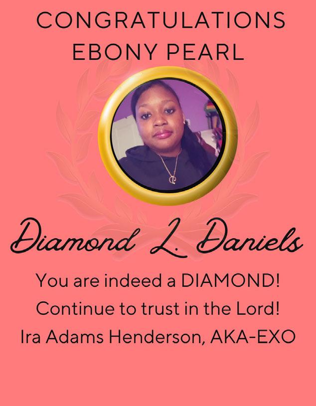 Greetings and Congratulations to the extraordinary young women we celebrate this evening, our beautiful Ebony Pearls!! You are indeed Powerful, Poised and Purposed. You walk with grace, lead with confidence and inspire with excellence. As our future leaders, you embody scholastic achievement, insight and wisdom beyond your years. You proudly carry the torch of greatness, standing on the shoulders of our ancestors, while inspiring generations to come. With gratitude and admiration, we honor each of you. The future is yours to conquer and we cannot wait to see all that you will accomplish!