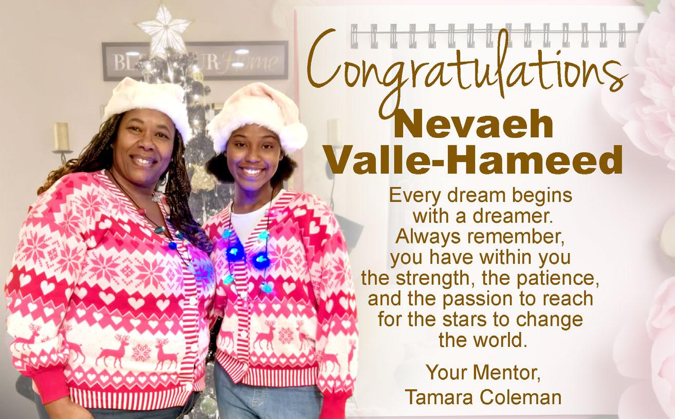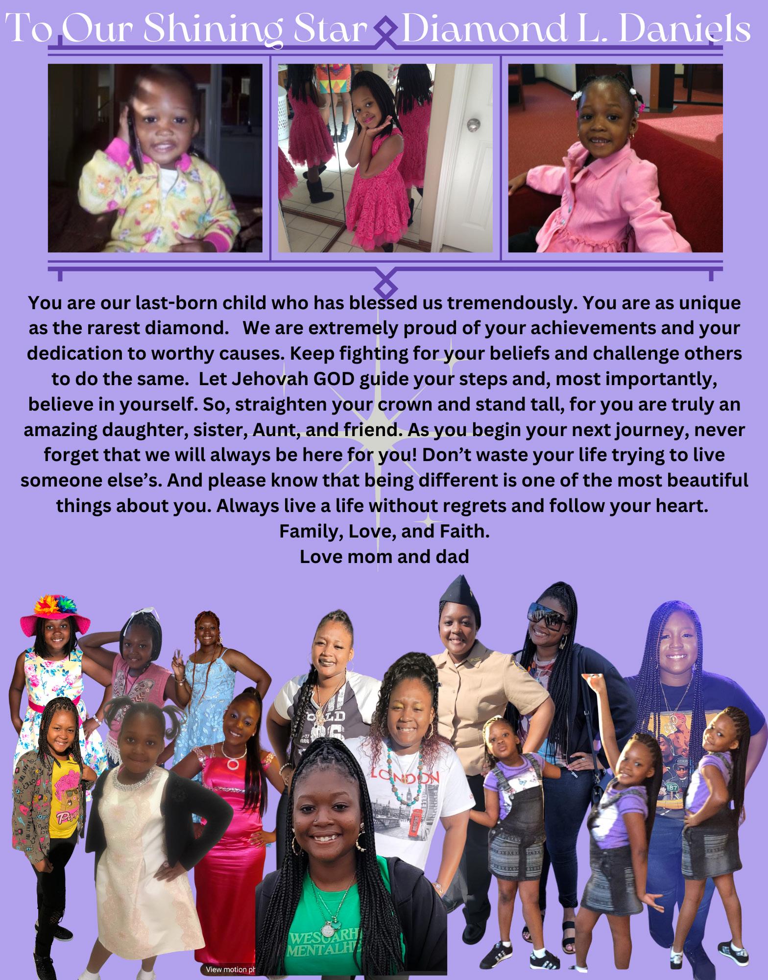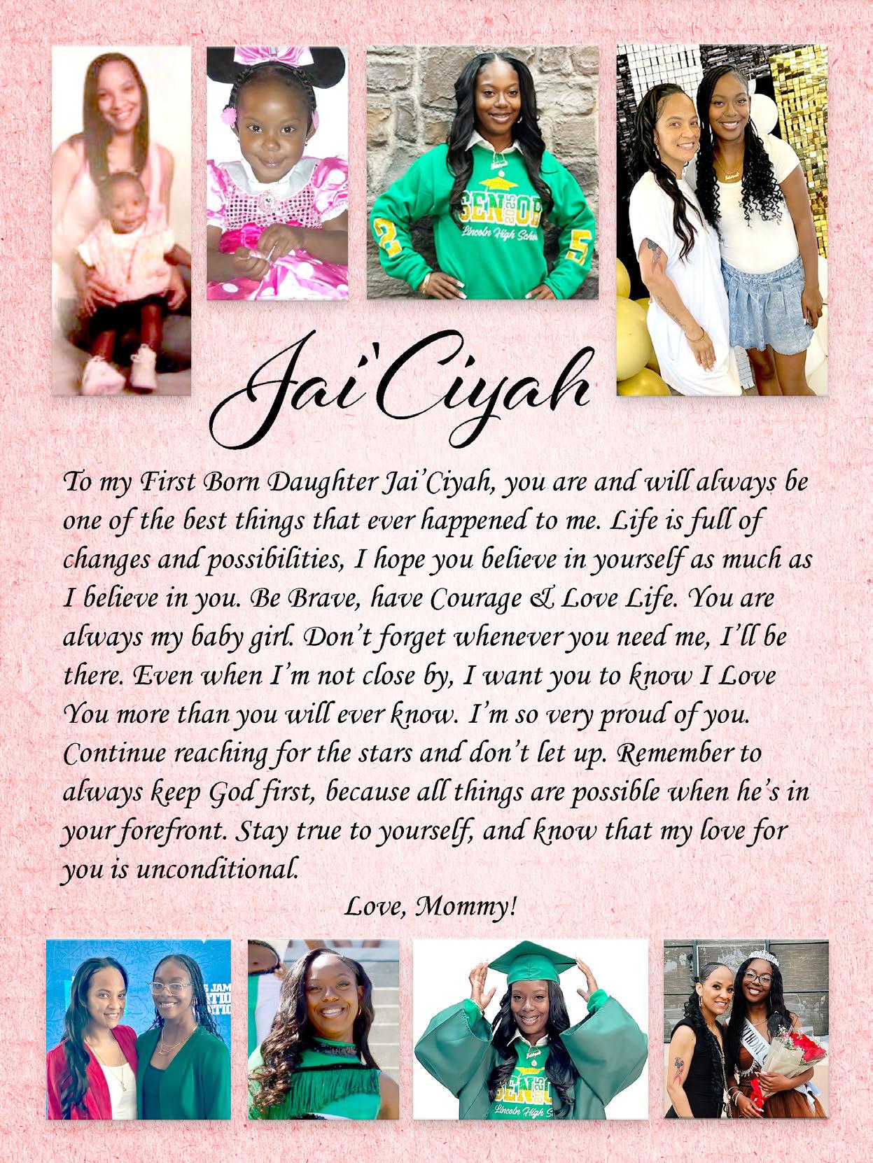 Nevaeh, my first, my lifeline, My favorite human! Words could never express how proud we are of the young lady you are becoming. God definitely did His big one when he created such a humble, caring, lovable young lady like yourself to be my daughter. It’s been an honor raising such a sweet girl. Over the past 17 years you truly taught me patience and how to love unconditionally. Remain humble and never change who you are to please man. Keep an open mind and always be open to learn and grow. Let your light shine and allow God to move through your bright soul! I’m so confident that you will be great. All the many accomplishments you’ve had this far, there has to be many more to come. Remember who you are and Who’s you are; child of a the most high which makes you royalty! Keep your head high, shoulders back and remind yourself: I am beautiful, I am smart. Mommy loves you so does the Lord. Love you more Mommy!!