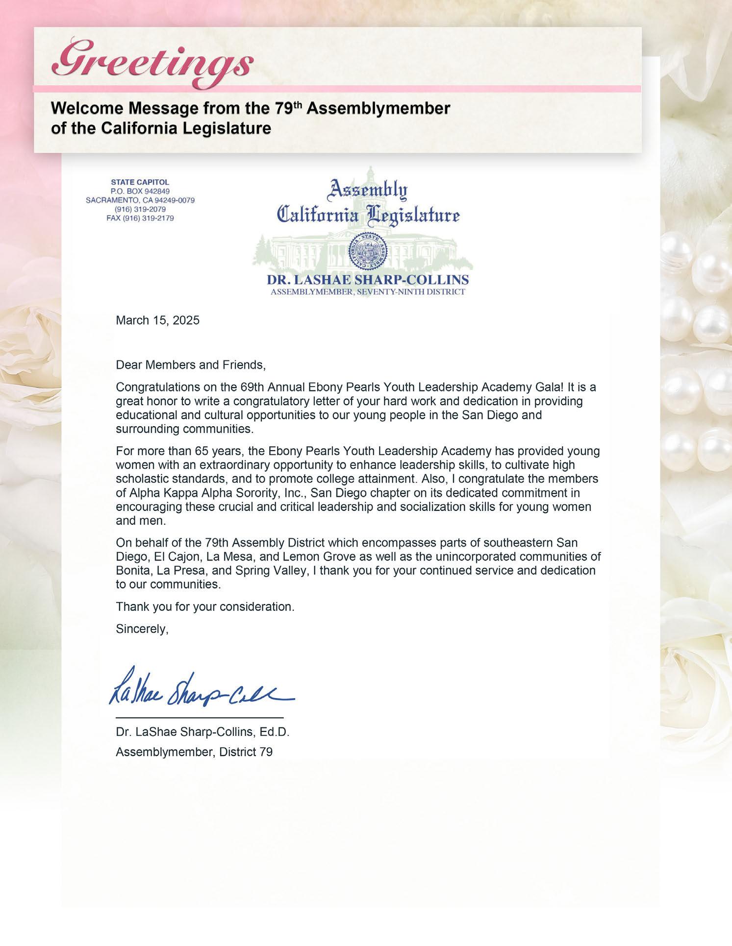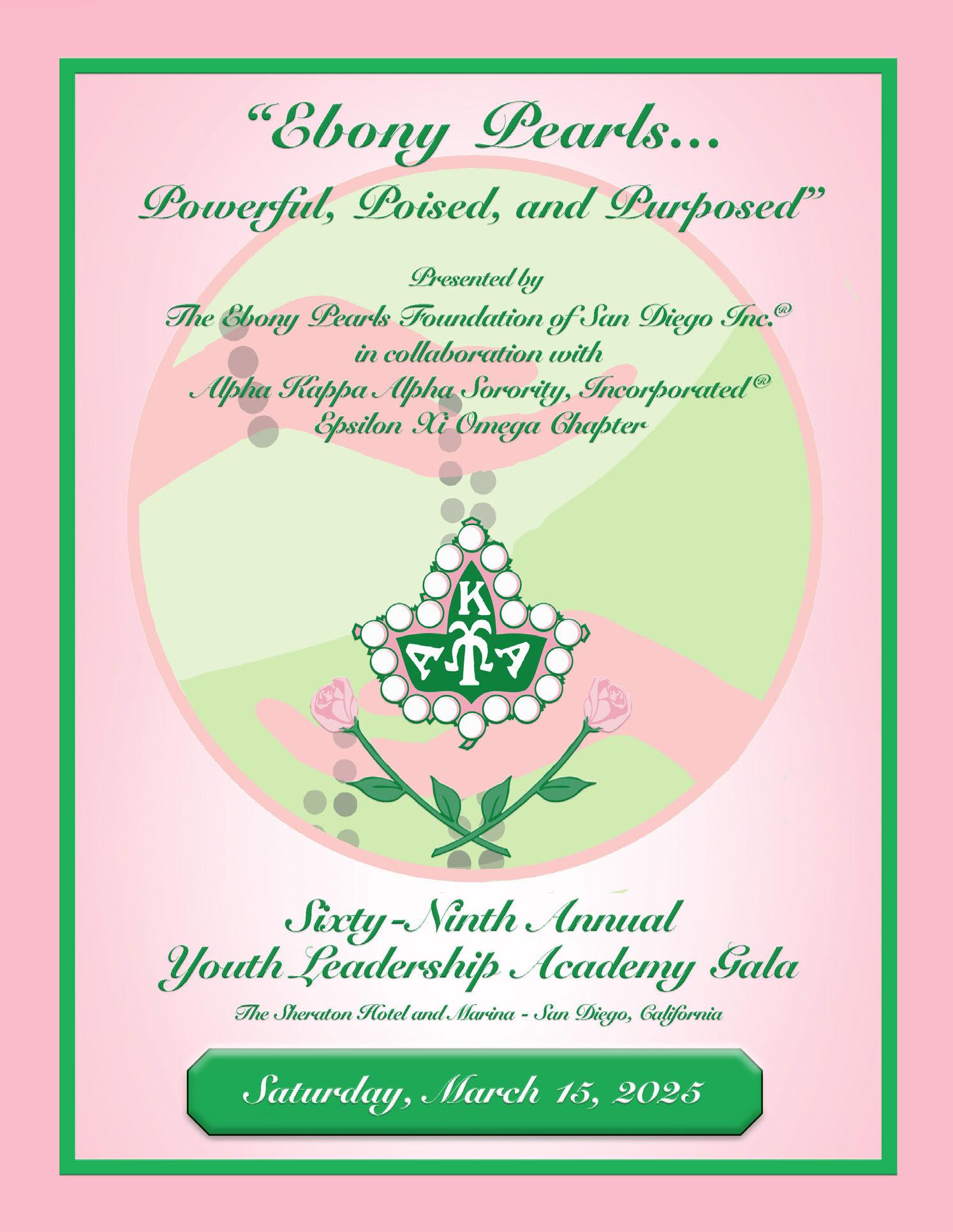 On behalf of the Ebony Pearls Foundation of San Diego Incorporated® and Alpha Kappa Alpha Sorority, Incorporated®, Epsilon Xi Omega Chapter, we welcome you to the Sixty-Ninth Annual Youth Leadership Academy Gala, “Ebony Pearls…Powerful, Poised and Purposed.” This event marks a significant milestone in the lives of the 14 young women being presented tonight. This is an auspicious occasion, not only for the Ebony Pearls, but also for their escorts, parents/guardians, and loved ones as they witness a transformation.