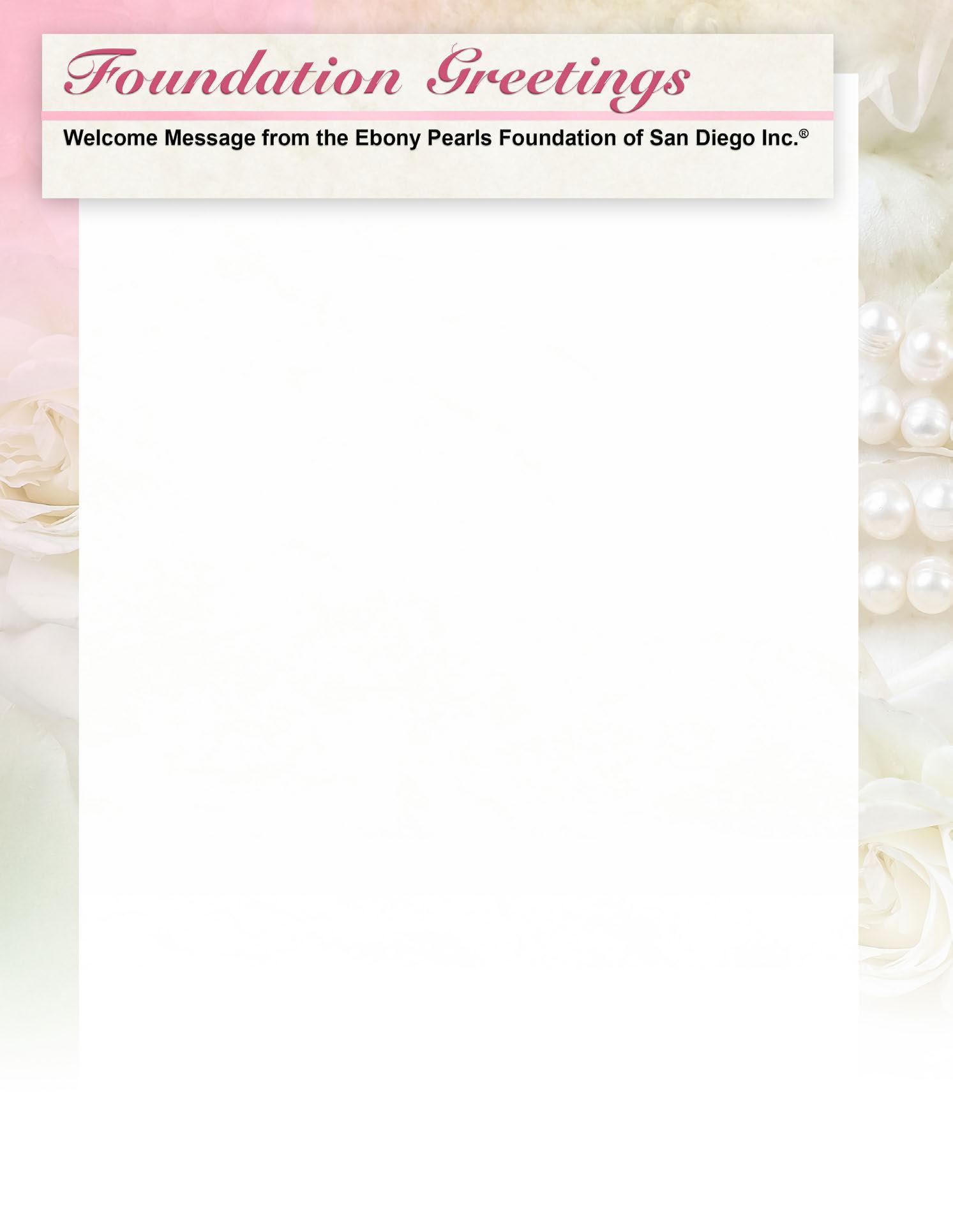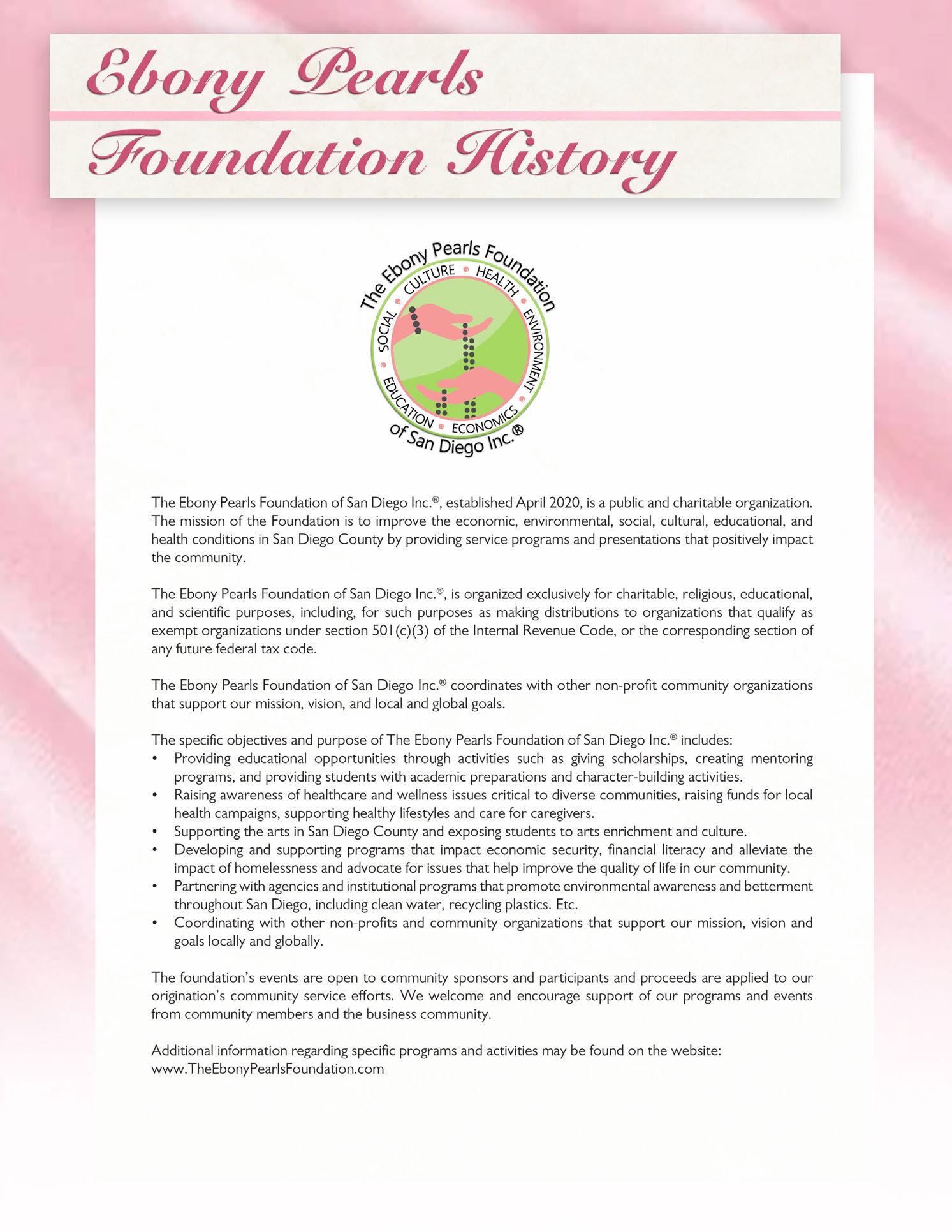 The Board of Directors of the Ebony Pearls Foundation of San Diego Inc. ® welcomes you to the sixty-ninth Annual Youth Leadership Gala. This event marks a significant milestone in the lives of the young women being presented tonight. This is a wonderful occasion, not only for the Ebony Pearls but also for parents/guardians, friends, and all of us who are present to share in tonight’s experience.