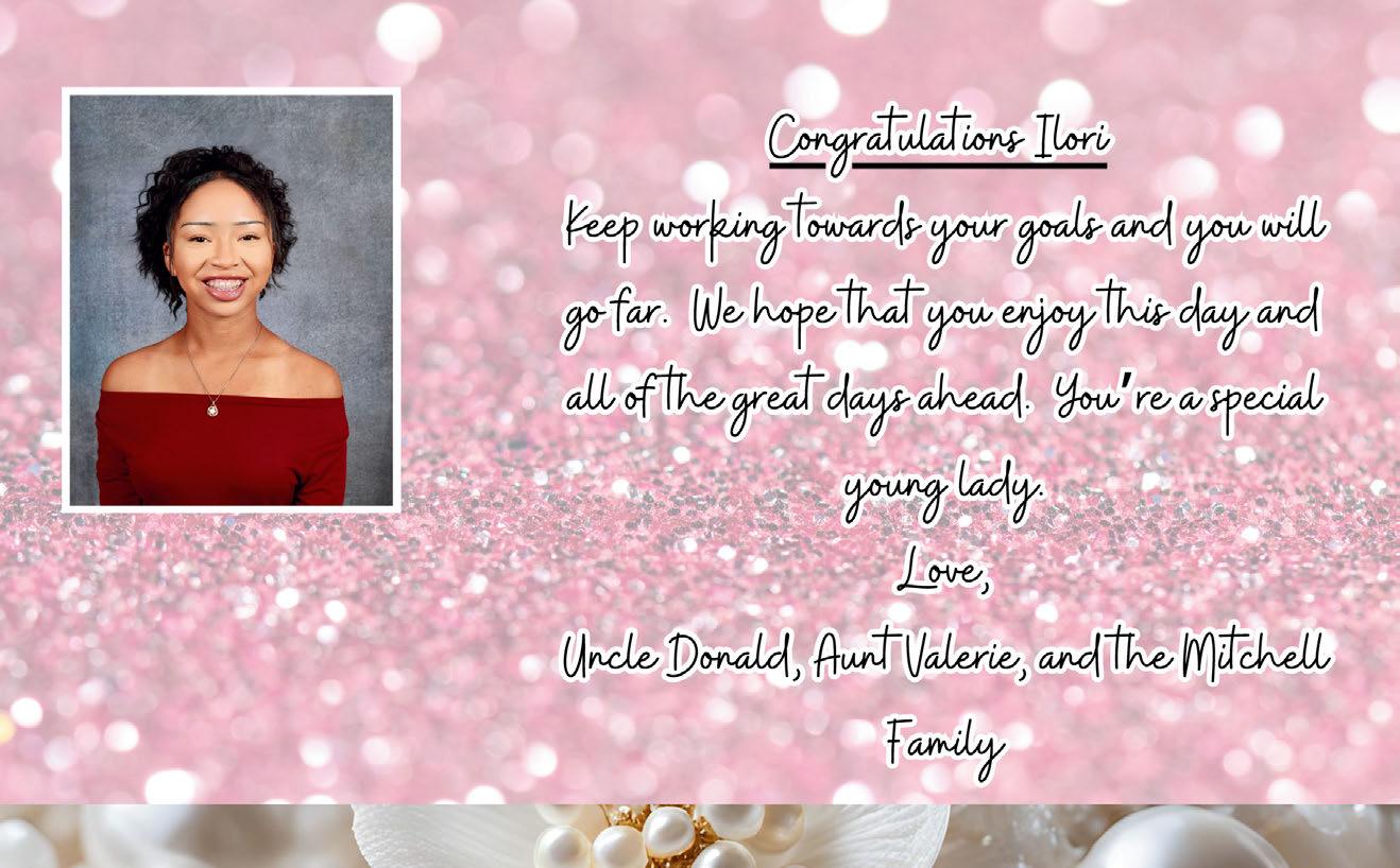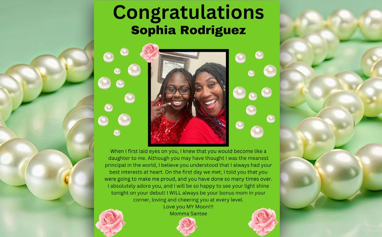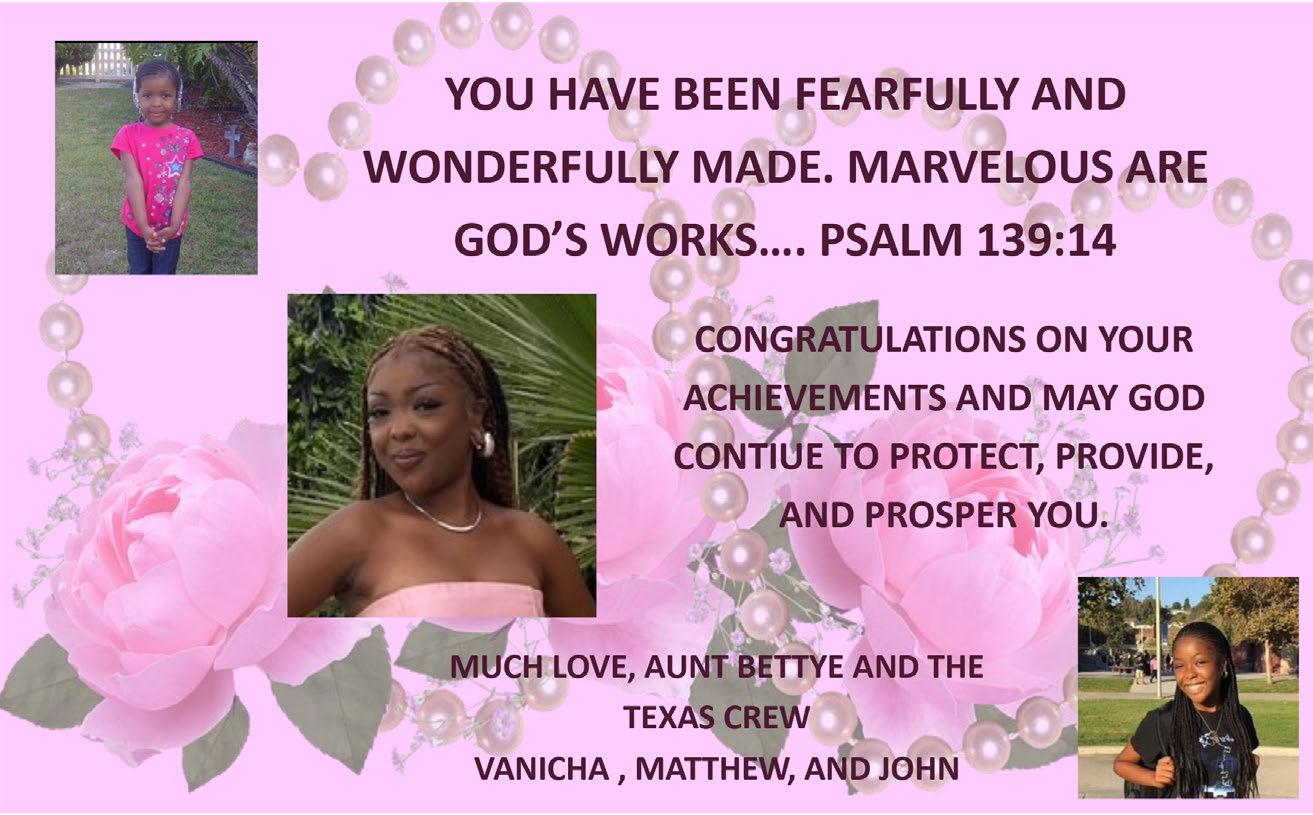 Your parents, guardians and family beam with pride tonight, knowing their love, sacrifices, guidance and wisdom have shaped you into the phenomenal women you are becoming. Your mentors stand beside you, applauding your dedication, commitment and perseverance to reach your goals. Your “village” lovingly lifts you up, honored to witness your brilliance and boundless potential, prayerfully acknowledging that it’s all in The Master’s Hands.
