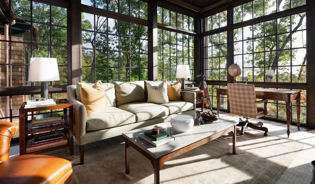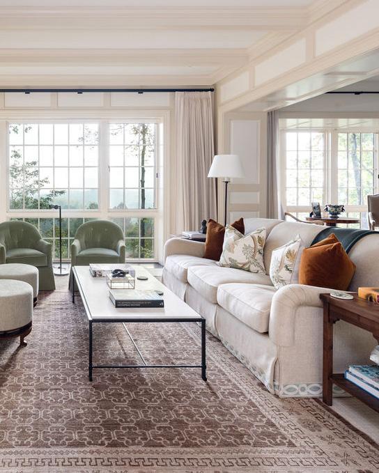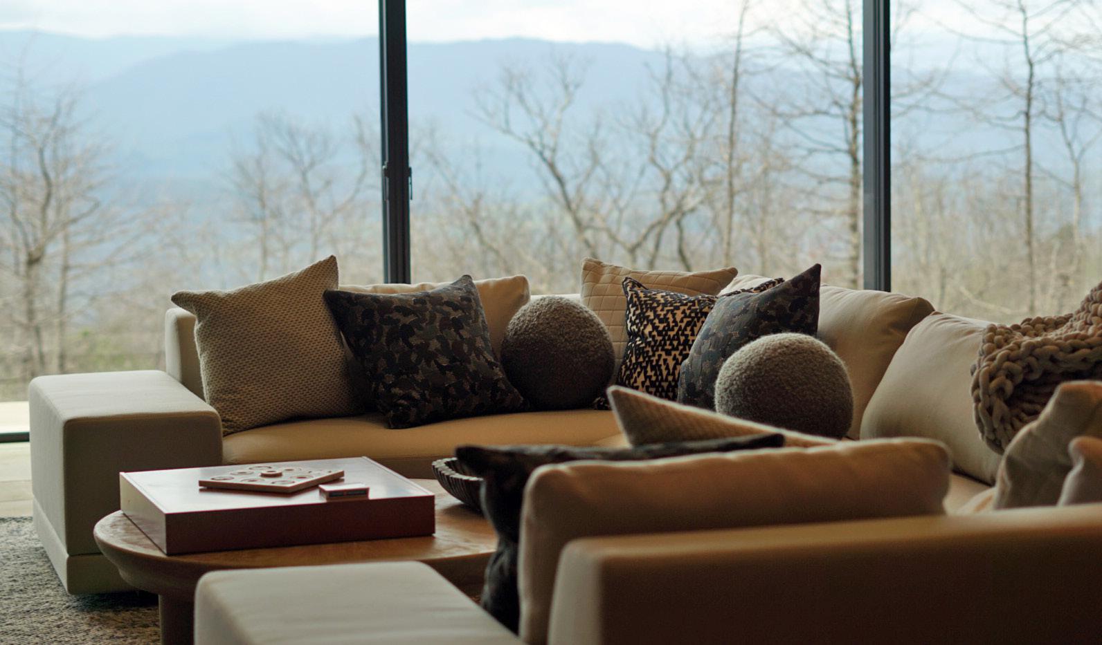 This Smoky Mountain residence was built to entertain a large extended family. Its seven bedrooms, bunk room, and nine baths allow the owners to comfortably host 18 guests at a time. The interior showcases a luxurious blend of new and antique furnishings that are layered with earthy colors, textures, and patterns.