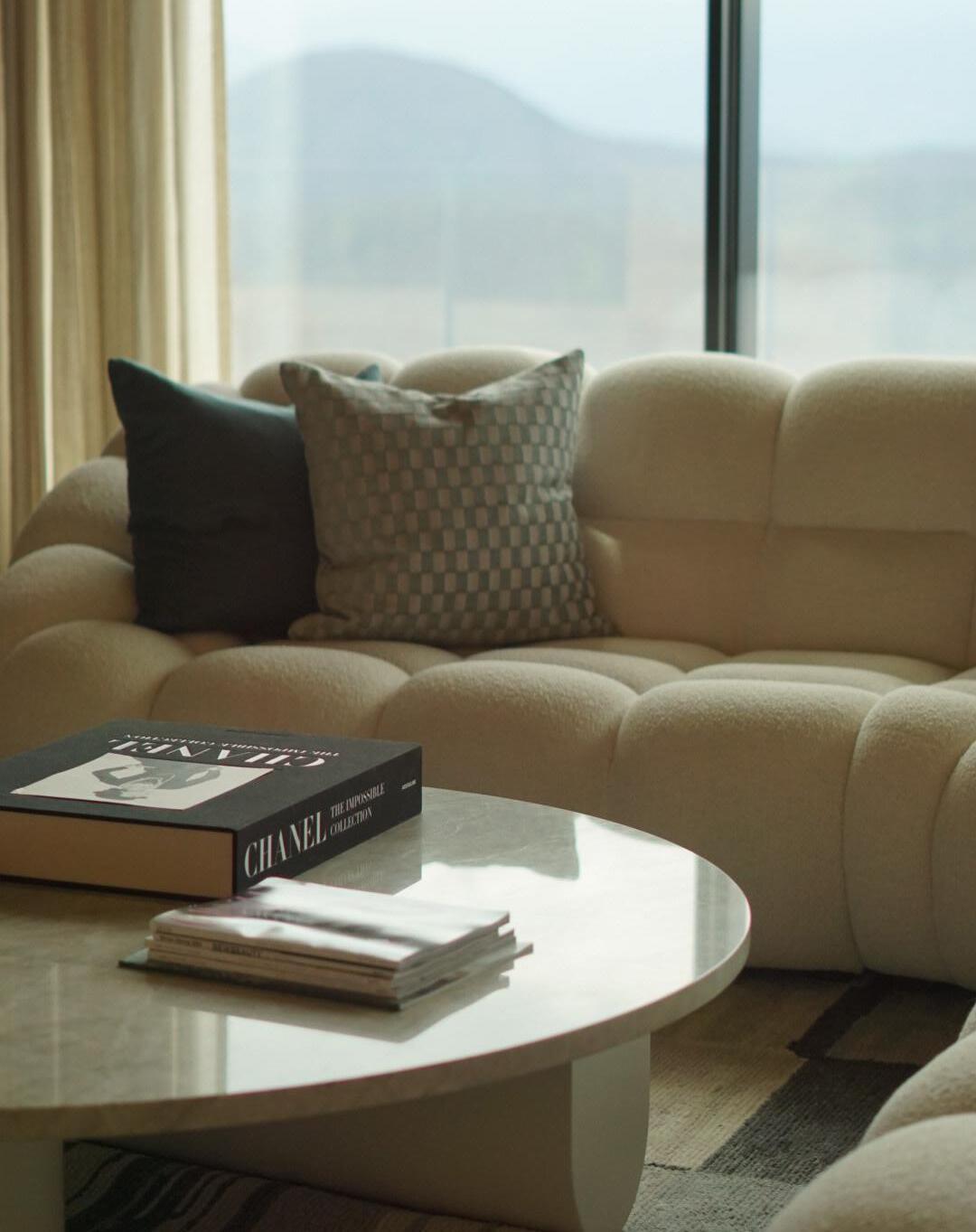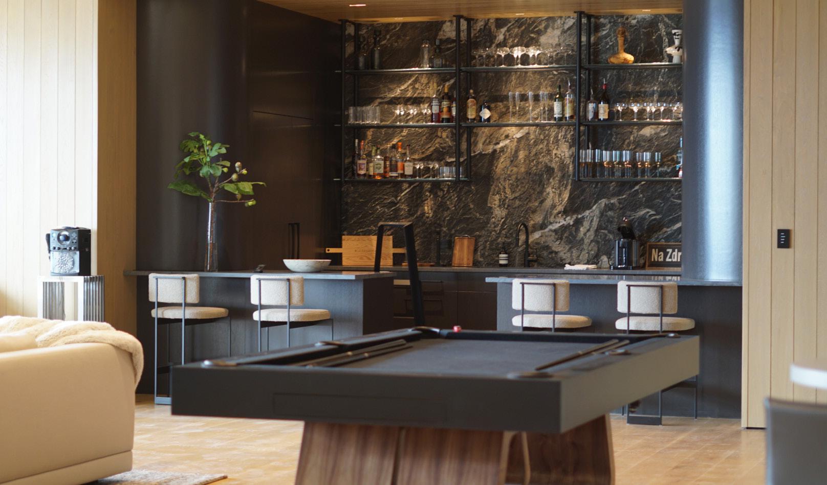 Perched on a premium Blackberry Mountain lot, this modern masterpiece is a sculptural take on Blackberry Farm’s signature layered, comfortable interiors. Every detail was meticulously designed from the custom topographical sink to the bistro-inspired banquette in the game room. Warm natural materials perfectly balance with the variety of fine textiles and statement light fixtures.
