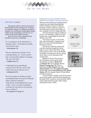 KAMEHAMEHA SCHOOLS CHILDREN’S CHORUS COOKBOOK AND COMPACT DISC NOW AVAILABLE With proceeds dedicated to helping finance a Japan tour, the official Kamehameha Schools Children’s Chorus Cookbook, featuring countless delicious recipes for Hawaiian (and non-Hawaiian) tastes, is now available for $10 by calling 842-8383. The Kamehameha Schools Children’s Chorus was founded in 1988 by Suzanne Kaupu Soon. Lynell Bright has been the director since 1989. The chorus consists of 114 fourth-, fifth- and sixth-graders, ranging in age from 9-12 years, from Kamehameha Elementary School. The chorus, which has performed with the Honolulu Symphony, Henry Kapono, twice with Celine Dion, on the Perry and Price Show and on the KHON and KHNL morning news shows, among many others, is now offering its first compact disc. Entitled Na¯ Keiki O Kamehameha, the CD features special guest artists The Brothers Cazimero (Robert ’67 and Roland ’68), Teresa Bright, Brother Noland (Conjugacion ’75), Nä Leo Pilimehana (Lehua Kalima Heine ’84, Nälani Jenkins Choy ’84, Angela Fernandez Morales ’84), I Mua (David Dunaway ’85, Albert Akiona ’85), The Anguay Sisters, Crystal Mateo and Henry Kapono. The CD will be available at the KS bookstore and at retail outlets across the state beginning in December 2000. A portion of the proceeds will be used to help fund the group’s trip to Japan, scheduled for June of 2001.