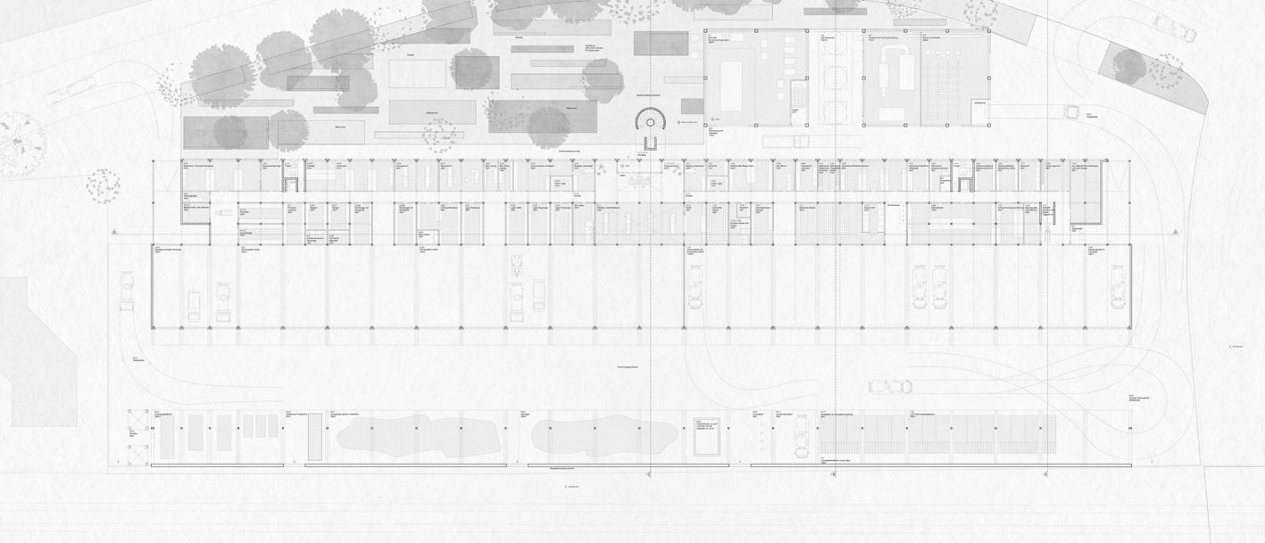 The site is located on an urban border - facing old urban tissue on one side and railway tracks with new urban development behind them on the other. In order to counter this peripheral condition, the programmatic functions are divided into three volumes: sculptural volume of the energy hub at the corner of the site, longitudinal volume of the fire station and the city depot in the middle, and the wall with outdoor supporting functions towards the railway tracks. This layout defines two outdoor spaces: public gardens in the North and the functional area in the South. This division is supported by the internal layout of the fire station and the city depot, with the doubleheight vehicle halls facing the railway and the office and workshop spaces facing the garden. Within the volume two ramps are located providing access to the roof parking.