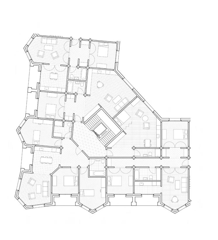 The typology of the buildings is influenced by two housing typologies found in Stockholm - point houses and star houses. The project aims to combine the advantages of both types - the contained plan of point houses which is easy to operate and put in an urban layout, and the lighting condition of starhouses in which the sunlight for one flat is provided from three directions.