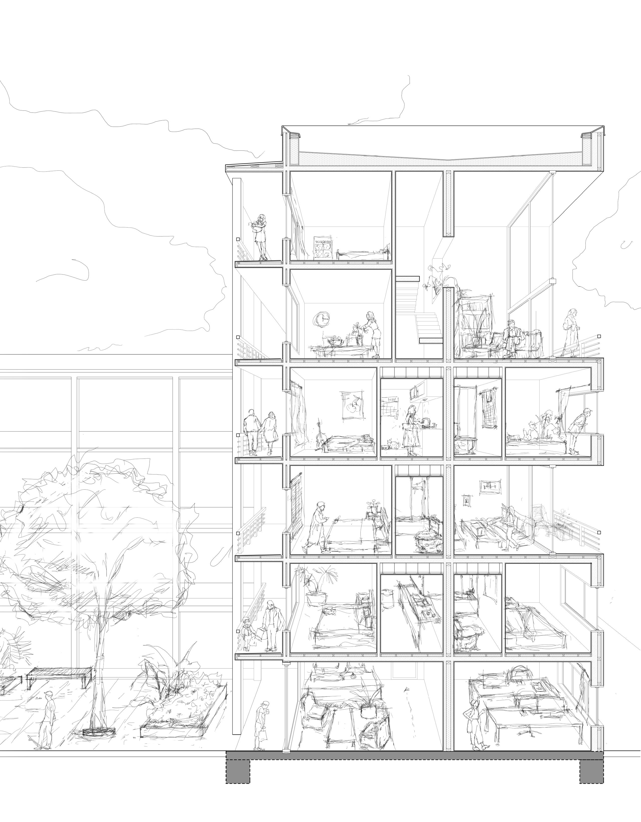 THIS PROJECT IS WITHIN A LARGER COMPLEX, INCLUDING THREE TYPES OF LIVING. IN COLLABORATION WITH SCARLETT AND ANNAMARIE, WE EACH DESIGNED A DIFFERENT TYPE, WITH A COMMON DNA OF ALTERNATING SETBACKS AND CONNECTIONS TO AN OUTDOOR CORRIDOR.