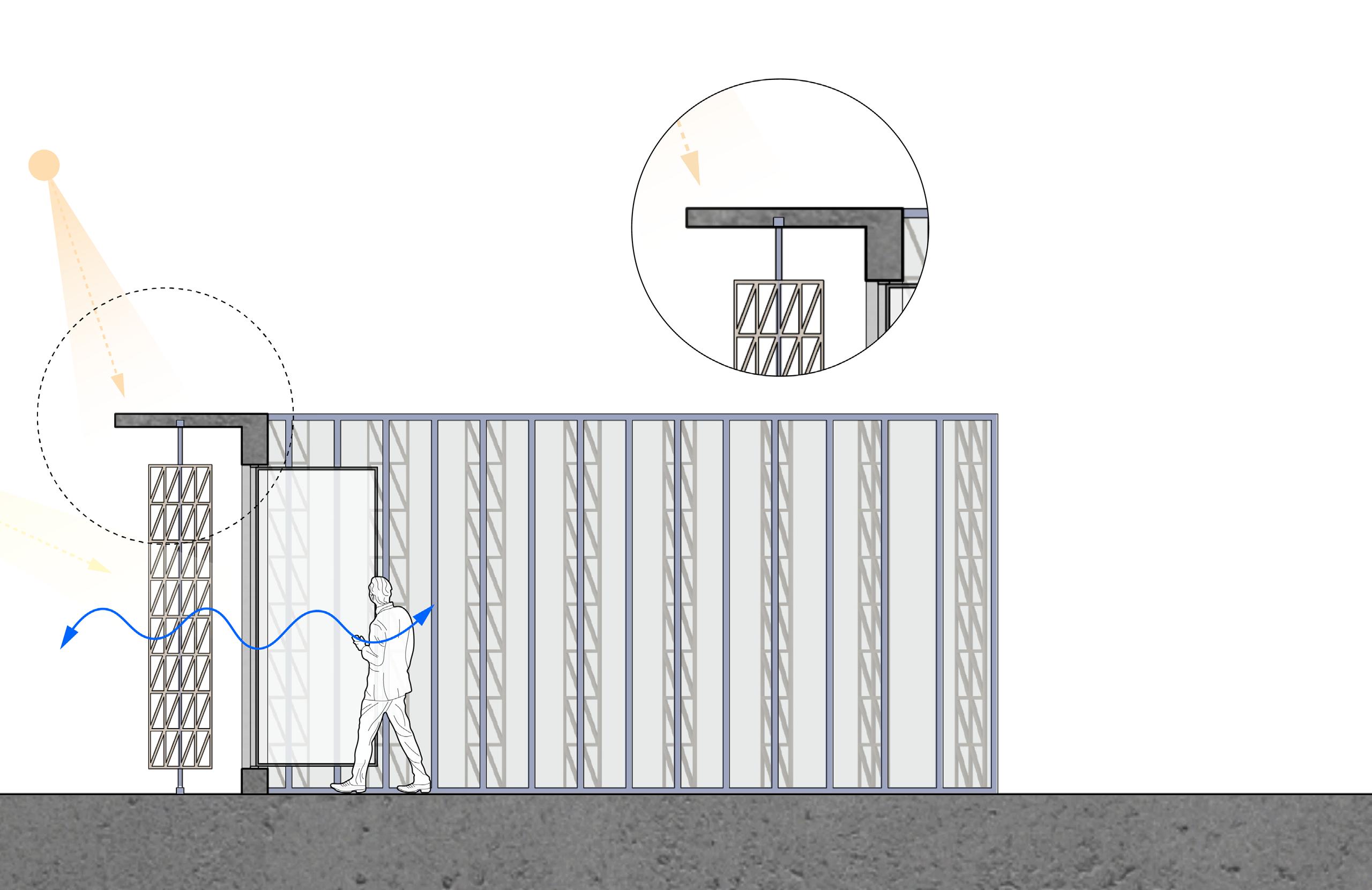ROTATING WOOD PANELS ON SOUTH FACADE ALLOWS USERS TO CUSTOMIZE THE AMOUNT OF SUN BEING LET IN THROUGH THE FACADE