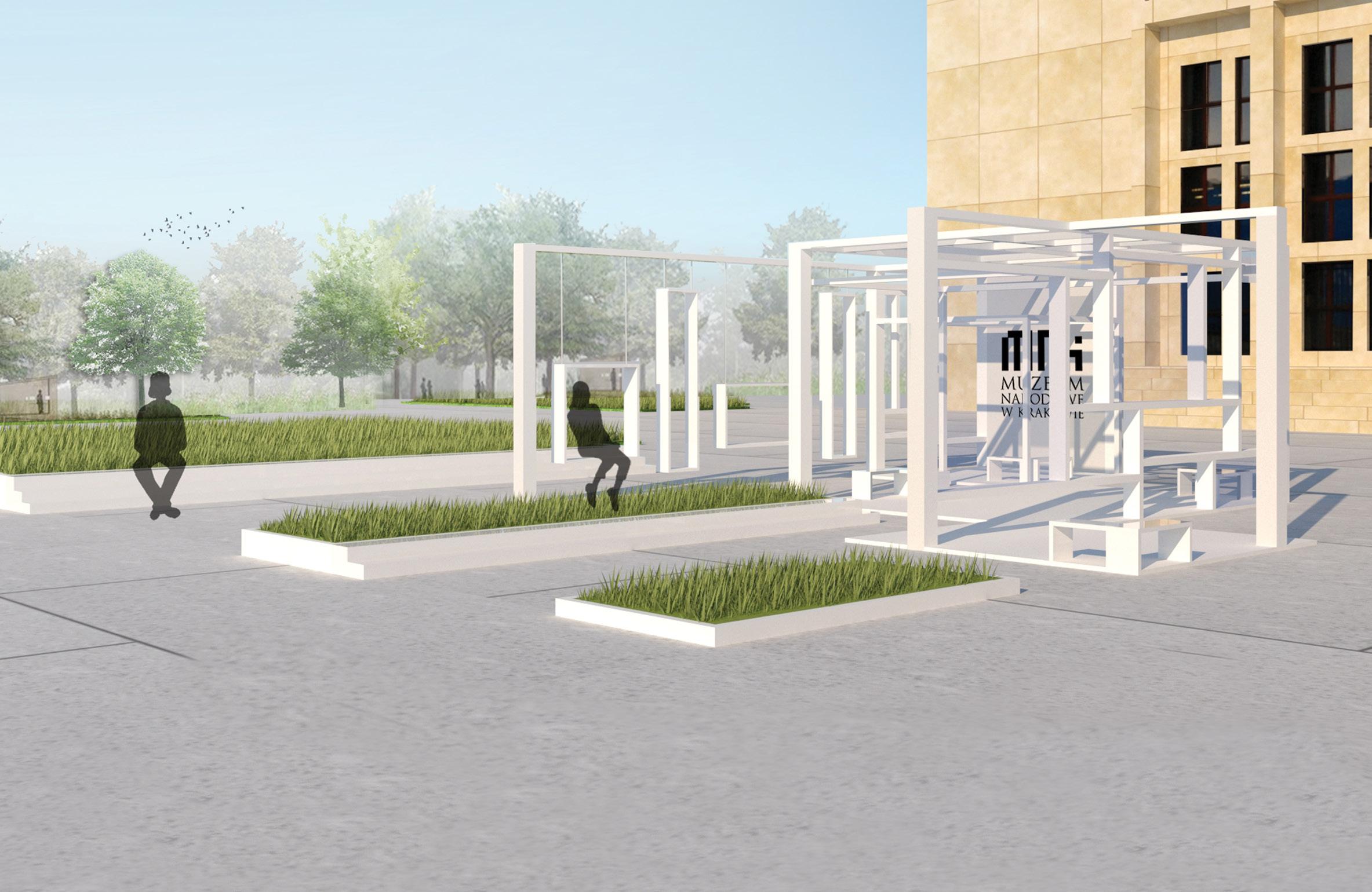Głównym założeniem projektu pawilonu interaktywnego na placu głównym, przed gmachem Muzeum Narodowego w Krakowie, było nawiązanie do geometrycznej konstrukcji budynku, w którym dominuje forma pionów i poziomów. W wyniku analizy budynku, za pomocą multiplikacji zostały wprowadzone drewniane konstrukcje w formie stelażu
