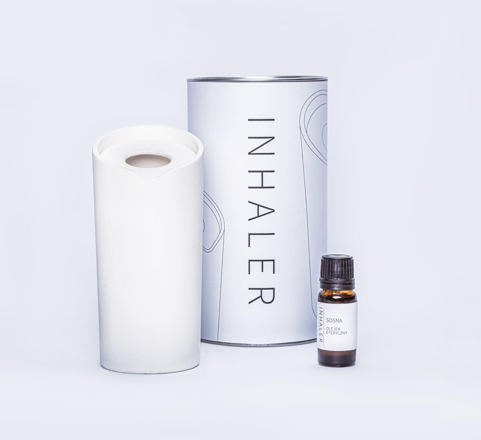 INHALER to inhalator do użytku domowego, skierowany dla osób narażonych na infekcje górnych dróg oddechowych wynikające ze specyfi ich pracy zawodowej. Projekt zakłada zapobieganie tworzeniu się infekcji oraz ich łagodzenie poprzez inhalację parową z dodatkiem olejku eterycznego. Ważnym założeniem projektu było zaprojektowanie produktu o ergonomicznym kształcie-wygodnym i bezpiecznym w trakcie użytkowania. INHALER działa w prosty sposób co umożliwia korzystanie w miejscu pracy lub zaciszu domowym, wystarczy wlać gorącą wodę i dodać parę kropel olejku sosnowego. Celem projektu jest połączenie tradycyjnej metody inhalacji z potrzebami współczesnego człowieka.