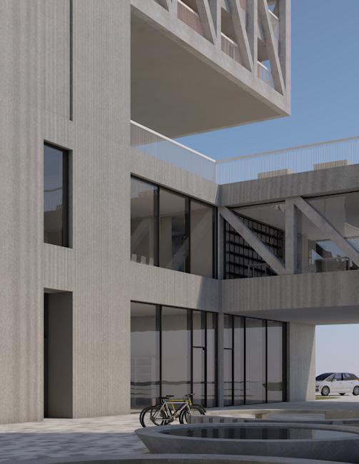 The ground and the first floor of the building mostly provide commercial and services areas. Their goal is to connect the building with the shared space outside of it. The opening to the courtyard on the corner is located strategically to invite people inside. Examples of services would be a bar, a restaurant, a local store or a nursery. They would serve the inhabitants and their neighbors. However, the residential and common areas are clearly separated from the outside world. Bicycle stands and inner storage are provided instead of a parking lot or underground garage. The whole design should integrate the community and encourage more sustainable living.