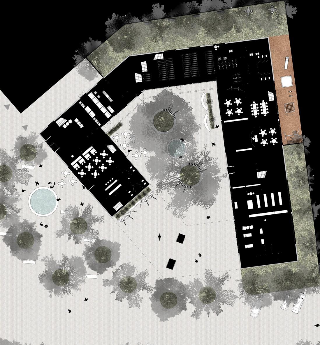 slow mobility designed main axis paths designed green areas with vegetation designed park area - lawn designed new vegetation ( trees) green roofs redesigned postindustrial buildings