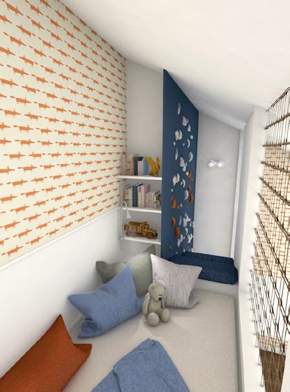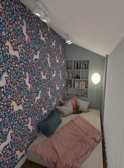 The transformation of the children’s rooms required adding mezzanines to extend their areas. In both cases the mezzanines became a playful addition. In this case many book shelves and places to read are creating a space for a little dreamer.