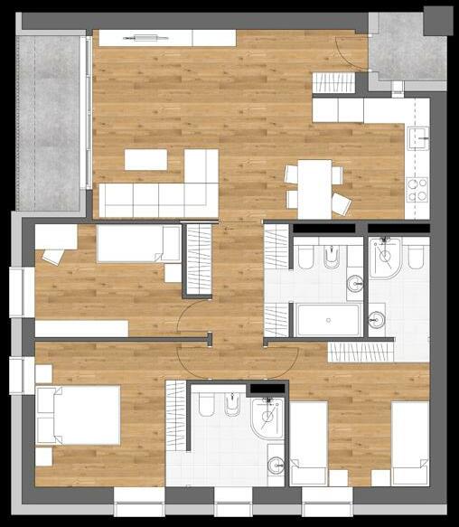 Apartments on lower levels have capacity fro two to four inhabitants. They were designed with consideration to the sun exposure. The more open and accessible day area is facing the west, while bedrooms are located on the east side of the building.
