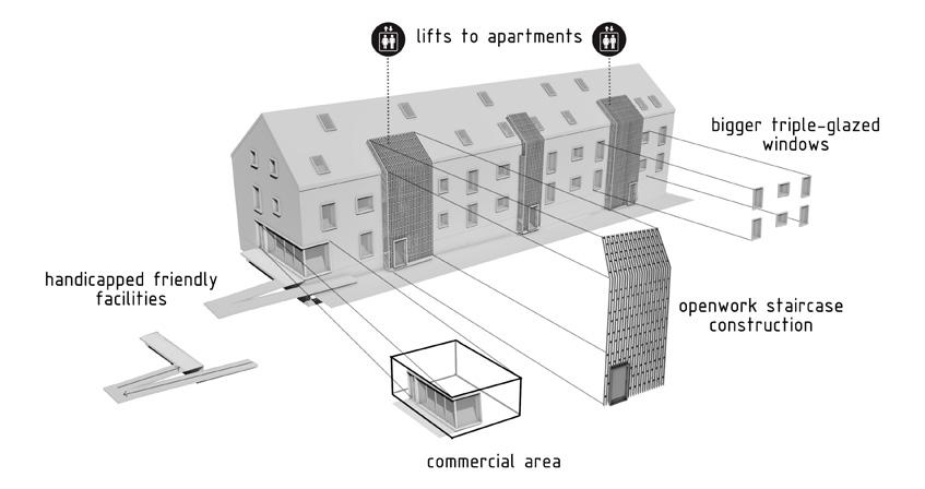 Increasing accessibility to apartments was a crucial point of the project. With this approach the two staircases were extended, therefore elevators could be added to them. Another important step included enlarging the apartments, by shifting balconies outside the outline of the building. Many sustainable solutions were introduced and implemented to meet strict Danish requirements.
