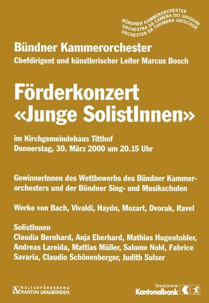 Das Erfolgskonzept war geboren, und dessen weitere Durchführung wurde von allen Parteien als wünschenswert erachtet. So folgte 2001 die Initiative, einen zweiten Wettbewerb mit anschliessendem Preisträgerkonzert zu veranstalten. Wiederum verlief die Ausscheidung für neun junge Talente erfolgreich, unter anderem auch für die zwölfjährige Flurina Sarott aus Scuol. Heute ist sie erste Geigerin bei der Kammerphilharmonie und in diversen anderen Orchestern im ganzen Land aktiv. Über ihre Erlebnisse aus dem Jahr 2002 berichtet sie gleich selbst.