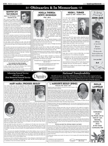 Obituaries & In Memoriam QUINTEN LEVI VAN HORLICK March 15, 1975 October 1, 2015 “Teammate for Life” After a long and courageous battle with his addictions, Quinten chose on Thursday, October 1 to head out on his next road trip. Born March 15, 1975 in Kamloops to John and Judy (Fisher) Van Horlick, Quinten’s personality traits of hard work and determination quickly became apparent . The diagnosis of a rare form of leukemia at the age of 14 months, made it necessary for Quint to have extended stays at the BC Children’s Hospital. At age 6 (much to the surprise of his team of doctors) Quint was declared cancer free. This was a huge milestone for the entire family but especially Quint. He was able to start school and join all his favorite sports leagues. Quint took his elementary schooling at 150 Mile House and Williams Lake, and his secondary schooling in Kamloops and Quesnel where he made many life-long friends. Throughout his school years, Quint was an avid and tenacious participant in many sports, including hockey, soccer, rugby, baseball, and crosscounty running. His main passion, hockey, enabled him to plav, coach and travel throughout North America. It also afforded him the opportunity to play on junior and semi-pro teams with his favourite team-mate, his brother Matt. Quint was able to give back and encourage the passion for hockey in many kids by developing his own hockey schools, as well as coaching and managing at hockey camps throughout North America. His love of running saw him participate in the very first Terry Fox Run and many more over the vears, including as recent as two weeks ago. In between, he attended numerous half and full marathons. Giving his time for charitable causes was also very important to Quint, as evidenced by his cooking for the less fortunate and volunteering at various fund-raising events. Left to cherish Quinten’s memory are his father John, mother Judy, brother Matt, half-sister Kaci, numerous cousins, aunts, uncles, extended family and far-reaching network of friends (All team-mates for life). “Let us remember the smiling, the laughing. the taiking, the sharing, the caring and the loving.” A tribute memorial to be held at the Kamloops Desert Gardens, 540 Seymour Street on Friday, October 9 at 3:30 pm. In lieu of flowers, donations may be made in Ouinten’s memory to the BC Children’s Hospital online at www.bcchf.ca/donate