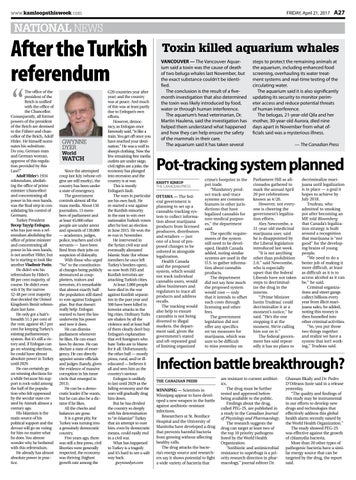 crime’s footprint in the pot trade. “Mandatory product track-and-trace systems are common features in other jurisdictions that have legalized cannabis for non-medical purposes,’’ the department said. The specific requirements of the system still need to be developed, Health Canada added, noting similar systems are used in the U.S. to gather information about cannabis products. The department did not say how much the proposed system would cost — only that it intends to offset such costs through licensing and other fees. The government legislation did not offer any specifics on tax measures for marijuana, which was sure to be difficult to miss yesterday on