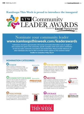 www.kamloopsthisweek.com/leaderawards Submissions should be approximately 250 words and include information such as: length of time nominee has spent in the community; specific examples of the work and/or contribution he/she has made; community associations and memberships. Please provide references of other individuals who may be able to provide further support on the nominee’s behalf. Deadline for nominations: Friday, May 24
