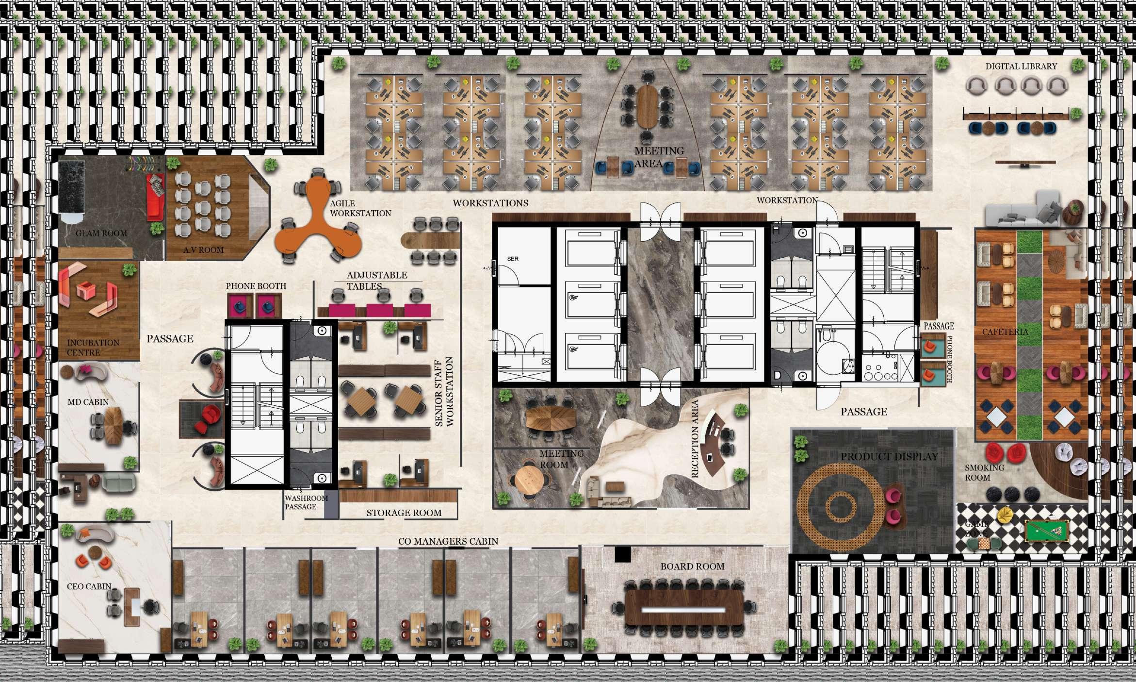 The core idea was to design a co-working space. The area assigned for this project was 10,000 sq ft. The office space has a capacity of 60-70 people. The interiors are based on the branding store. The concept is to have luxury yet comfortable workspace because of more working hours. In this office we have used warm coloured walls and lights because warm colours boost energy and inspire creativity and improve productivity. They are associated with heightened emotions and passion to work. in this design the circulation area is 12%. and there are small menook for chilling, phone booth and game zone for relaxation. there requirements were MD. cabin, CEO cabin, senior staff, manager, coworkers, meeting rooms, glam room , A.v room, incubation center, junior staff, incubation center, experience center and digital library and cafeteria. the colour theme and the ambienece of the space is created according to the HERMES brand store and working space.