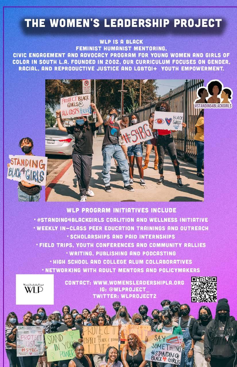 SikivuHutchinson&theYoungWomen’s FreedomCenter TheWomen’sLeadershipProject (WLP)isaBlackfeministmentoring, civicengagement,andadvocacy programdesignedtoeducateand trainhighschoolandcollege-aged youngwomenofcolorandBIPOC queeryouthinSouthL.A.totake ownershipoftheirschool communities.UsingaBlackfeminist humanistcurriculum,theWLPseeksto empoweryouthtodeveloptheirown voicesandself-determination, promotecriticalcons ciousnessabout andactivismaroundracialjustice, genderjusticeandreproductive justice,sexualviolence,domestic violenceandLGBTQIA+empowerment, whileprovidingthemwitha foundationtoprepareforcollege, communityactivism,andcareers.