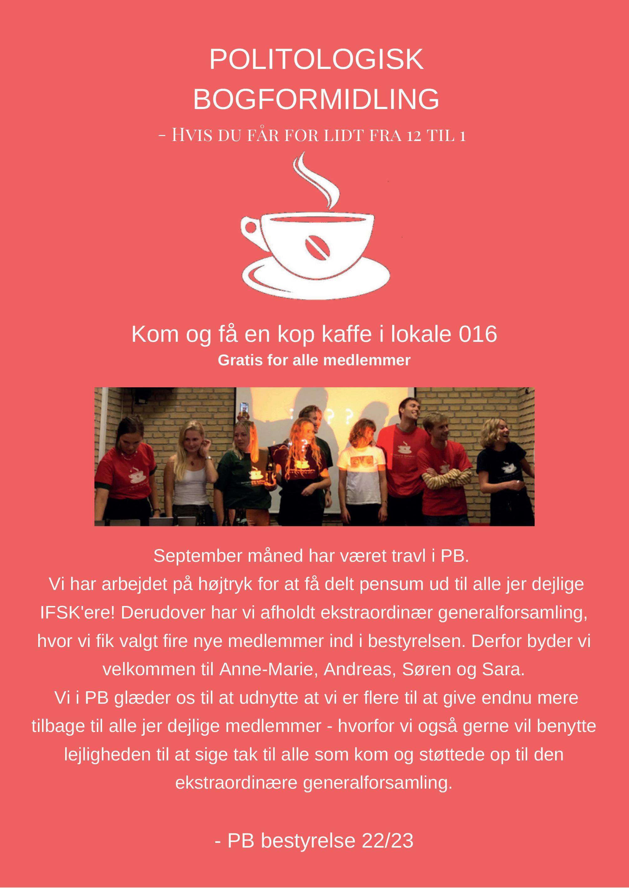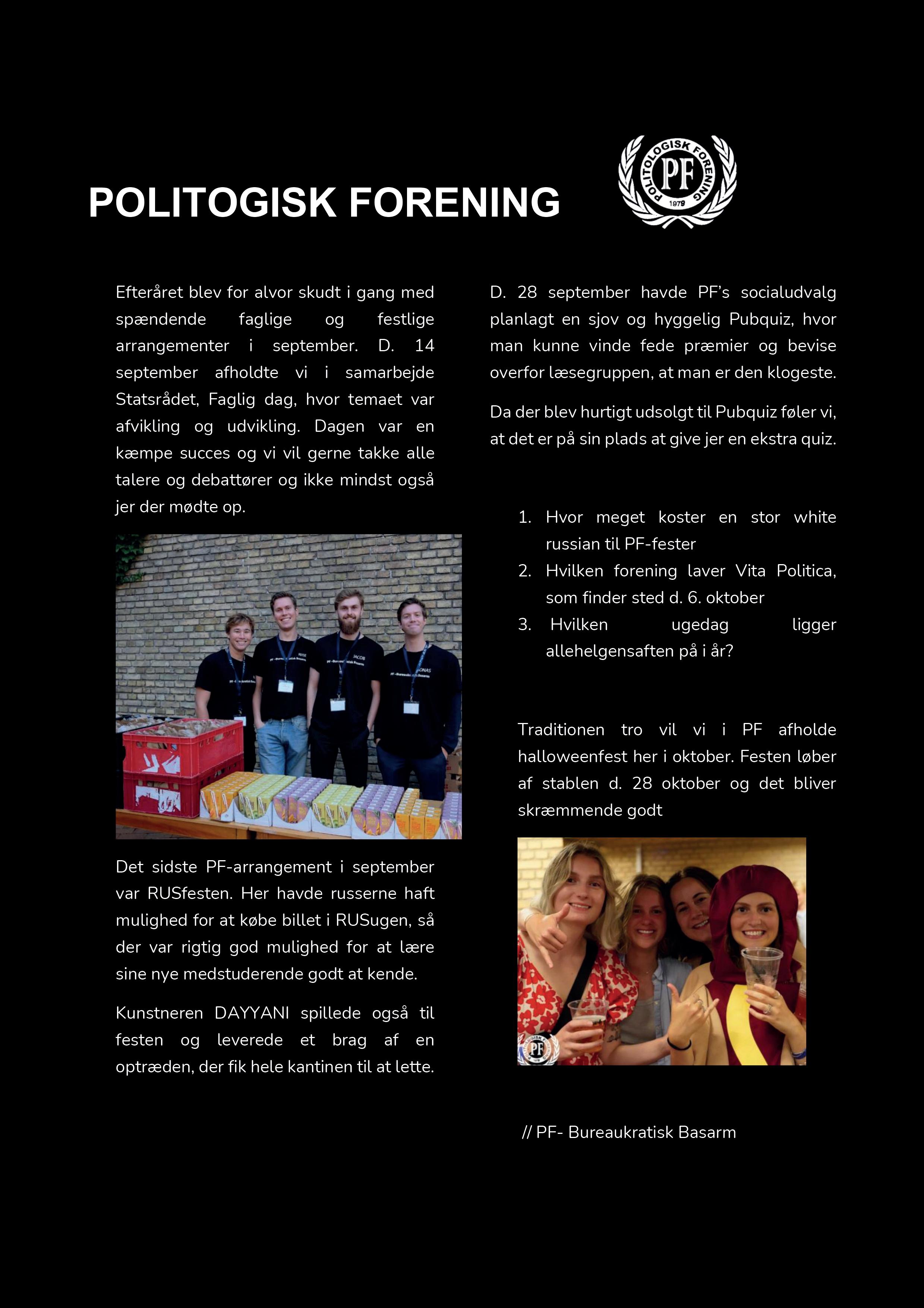 Men når omstændighederne er så tyngende, må det være op til os selv at holde hovedet højt, træde videre i hamsterhjulet, og ellers bare tillægge sig en lidt apatisk holdning til alt. Og så ellers bare gå lidt i byen, holde nogle fester, negligere studierne og leve lidt. Bare lidt. Brug dine penge nu, inden inflationen udhuler din opsparing. I Kanden tager vi vores tørn ved at holde en masse dejlige sociale arrangementer den kommende tid, og du, kære læser, er meget velkommen! Både til de sociale arrangementer specifikt og bladet generelt. Vi vil gerne have flere med på vognen uanset hvilket køn, hudfarve eller politisk overbevisning (medmindre du er nazist).