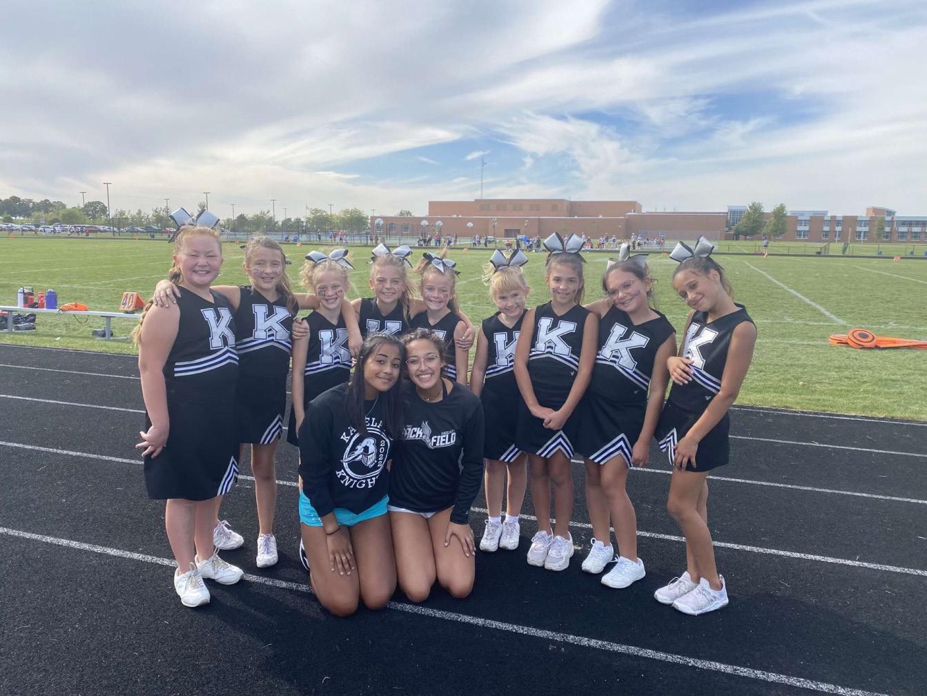 Photo courtesy of Keelyn Devine Senior Keelyn Devine (bottom left) poses with fellow coach and Kaneland alum Abigail Burroughs and their 2021-22 fourth and fifth grade sideline and competition team. All of the athletes on the team at the time the picture was taken still cheer for KYFL with Devine.