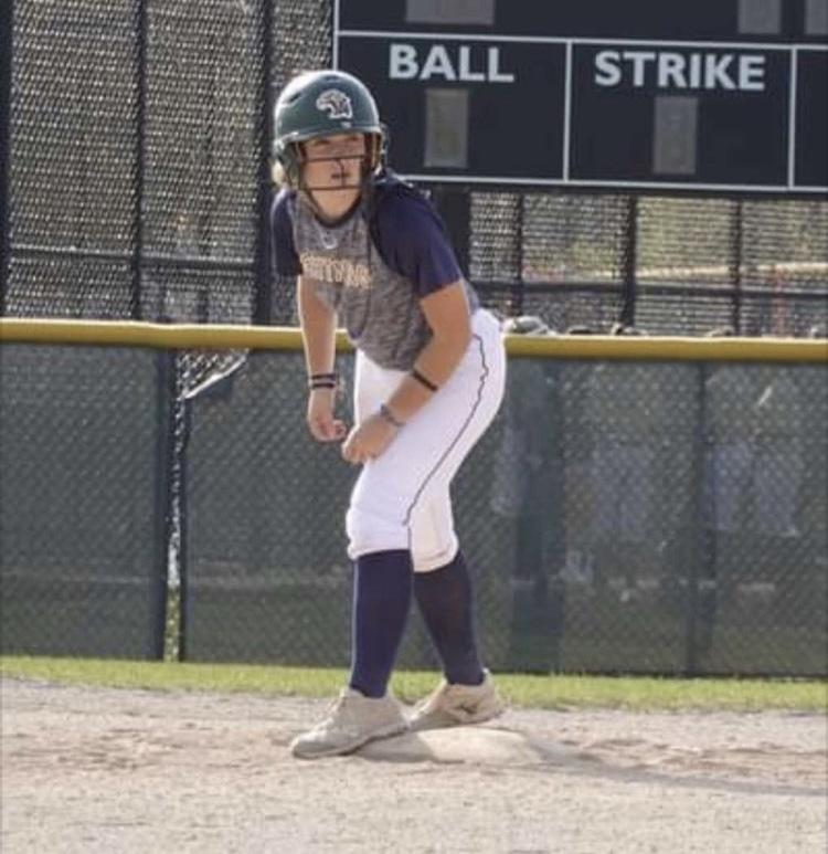 Photo courtesy of Olivia Stoker Senior Olivia Stoker waits on second base to see the play develop. She has played softball through the school and on a travel team for 12 years.