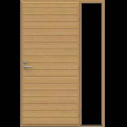 Ovi- ja ikkunatoimittajamme Tiivi kehitti Kannustalolle täysin uuden sisäänkäynnin. Siinä pääoven ympärillä olevat kiinteät ikkunat tai avattava levike on yhdistetty samaan karmiin oven kanssa. Tuloksena on uudennäköinen, kutsuva sisääntulo. Ovessa on ympäristöystävällinen ECO-rakenne, jossa käytetään eristeenä puukuitua. Massiivitammikynnyksessä on alumiiniprofiilit.