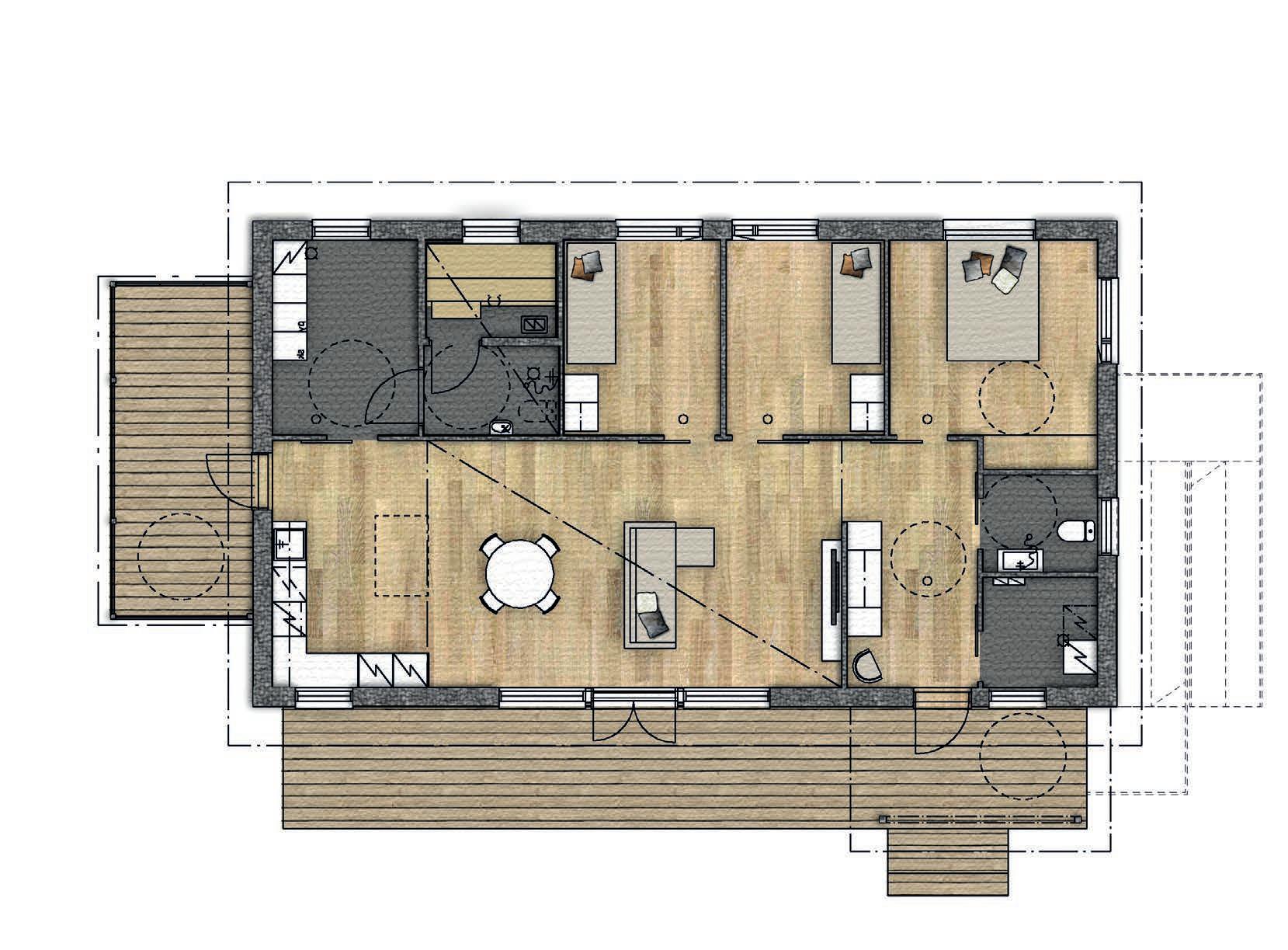 Pohjaratkaisun lähtökohtana on ollut asuntomessutalomme Lato 123. Avarassa ja valoisassa eteisessä on paljon säilytystilaa, myös tekninen tila toimii vaatehuoneena tai varastona. Esteetön makuuhuone voi olla esimerkiksi nuorelle, joka kaipaa jo omaa rauhaa. Esteetön pesuhuone on välittömässä läheisyydessä ja makuuhuoneesta on mahdollista avata sinne suora sisäänkäynti.