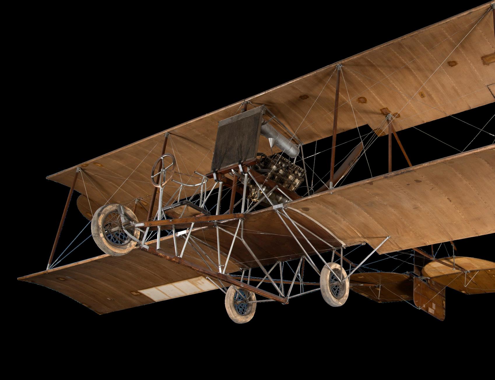 The Billard family donated Longren No. 5 to the Kansas Historical Society in memory of Philip Billard, who served as a test pilot in France during World War I and was killed when his engine stalled in 1918. The pilot flew this pushertype biplane after crashing his Longren Model G. Pictured from left are Kirke Mechem, U.S. Senator Arthur Capper, Mayor Herbert G. Barrett, and Robert T. Billard at the July 1938 biplane presentation. Longren No. 5, will be featured in the Kansas Museum of History’s new exhibits.