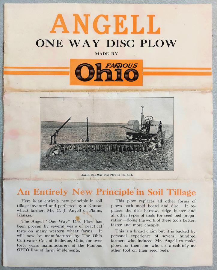 The Charles J. Angell, Sr., collection includes photographs, correspondence, advertisements, sketches, and newspaper articles related to Charles J. Angell, Sr., inventor of the one-way disc plow. Charles and his son, Francis Angell, developed the one-way disc plow in the mid-1920s. Together, they built about 500 plows on their Meade County farm, with the plow becoming the most commonly used tillage implement on the plains. The plow set all disks at the same angle or “one-way” to increase tilling efficiency. Farmers liked that it plowed faster and broke up hard soil easily, but its overuse created a fine, dusty layer that quickly blew away in heavy winds. Charles later sold the rights to the plow to the Ohio Cultivator Company.