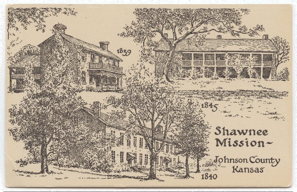 The Shawnee Tribe and many other eastern Indigenous peoples were forcibly moved to present-day Kansas beginning in the 1830s. Missouri Shawnee leader Chief Fish requested a missionary in 1830, and the Reverend Thomas Johnson was appointed. Shawnee Methodist Mission opened as a one-room school the following year near Chouteau’s Trading Post in Wyandotte County. With accommodations only for the Shawnee and Delaware peoples, the Reverend Johnson proposed a larger school to serve many Indigenous children. The current site, positioned along the Santa Fe, Oregon, and California trails in presentday Fairway (Johnson County), was selected for the new school that opened in 1839. Among the students learning basic academics, manual arts, and agriculture were children of the Cherokee Nation, Chippewa Tribe, Delaware Tribe, Gros Ventre Tribe, Kaw Nation, Kickapoo Tribe, Munsee Band, Omaha Tribe, Osage Nation, Otoe-Missouria Tribe, Ottawa Tribe, Peoria Tribe, Potawatomi Nation, Shawnee Tribe, Wea Tribe, and Wyandot Nation. This was the largest mission in the area, with 16 buildings on 2,000 acres, and an enrollment of nearly 200 boys and girls aged five to 23. Neither this location nor the previous one-room building had forced federally-mandated enrollment.