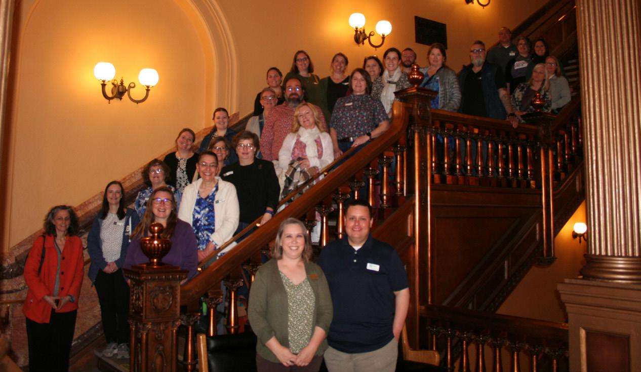 Representatives from 11 historic preservation offices and the National Park Service gather on the steps in the Kansas State Capitol.