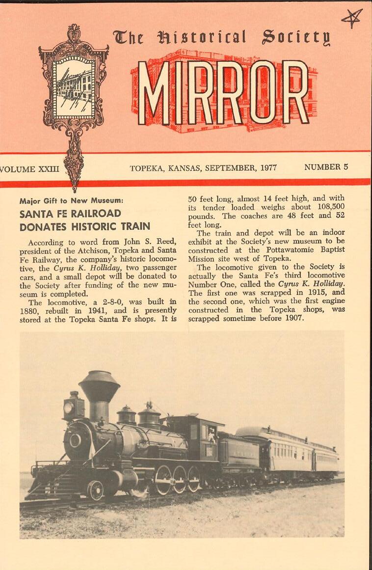 The Society added a newsletter, the Mirror, which launched in January 1955. The publication was inspired by Angelo C. Scott, publisher of the Iola Register and 19541955 president of the Society, to raise awareness. Secretary Nyle Miller accepted the proposal, promising not to “bore prospective readers.” The Mirror offered insights into the Society’s active projects, sites, employees,
