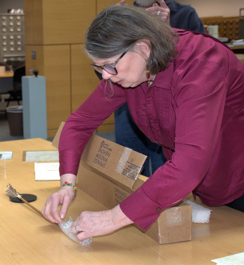 Debbie Stanton, Museum and Education intern, cataloged museum artifacts, including a large recently donated milling collection. Stanton is pursuing a certificate in museum studies from the Institute of American Indian Arts. She is manager of the Alice C. Sabatini Art Gallery at the Topeka Public Library and has worked 15 years as a professional librarian.