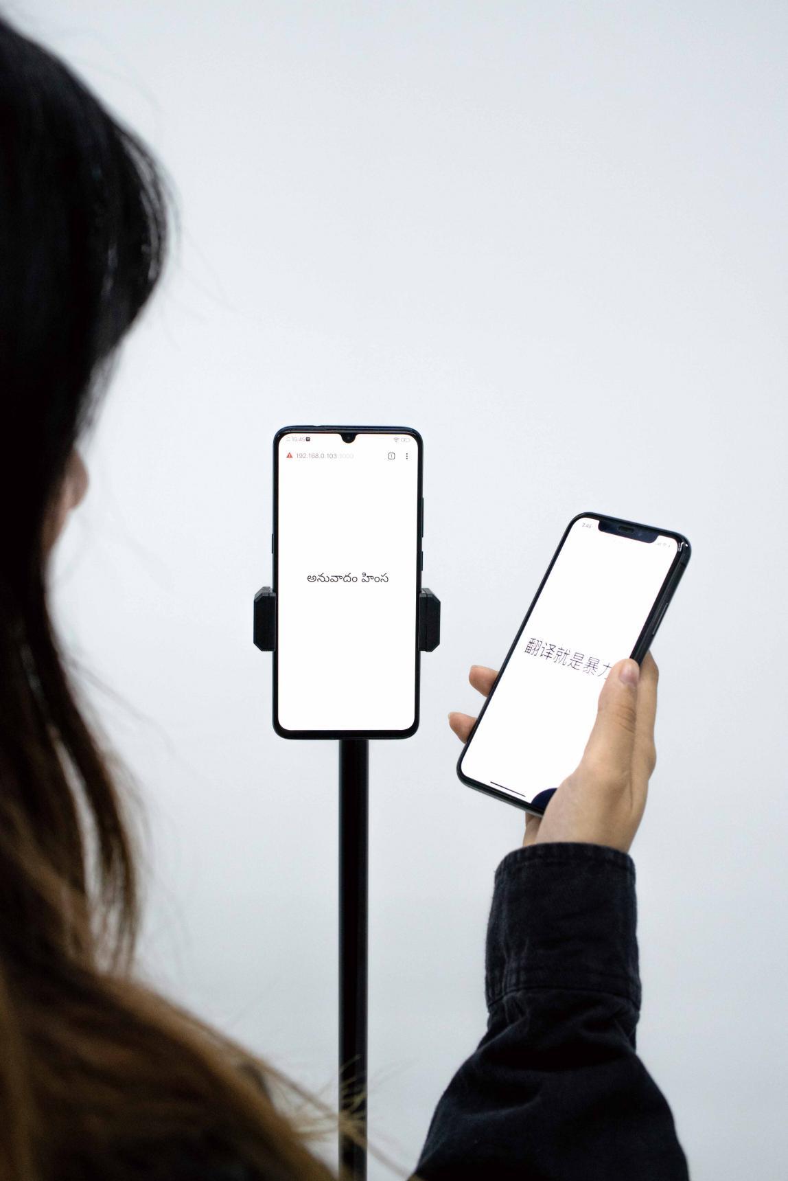 翻訳したい言語を入力する。すると1機目のスマホは アラビア語に翻訳され、それが2機目でロシア語、3