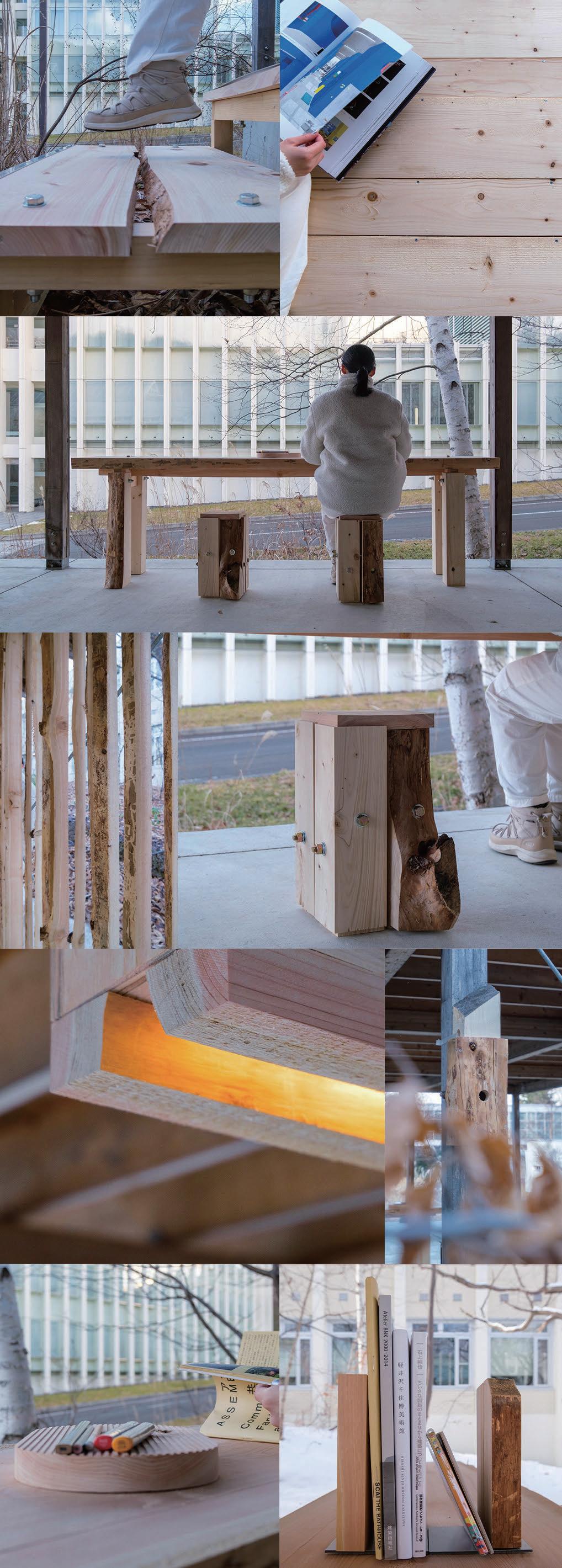本制作では、9種類計12点の什器群による休憩施設 の木質化を行い《樹木の再盛》と名付けた(図4)。
