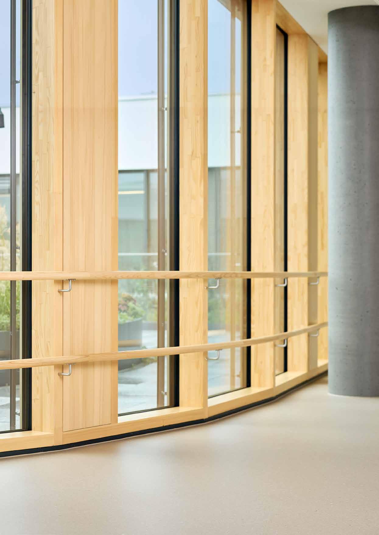 «Bald öffnet der Neubau seine Türen! Treten Sie jetzt schon ein und spüren Sie die Atmosphäre des neuen Spitals und seiner ‹Healing Architecture›: Weite Gänge, lichtdurchflutete Räume, sanfte Farben und natürliche Materialien wie Holz und Stein schaffen ein Wohlfühlambiente, das Heilung unterstützt – für Patienten und Mitarbeitende. Keine engen oder düsteren Korridore, sondern klare Wege und begrünte Terrassen für frische Luft und Entspannung. Der Neubau verbindet Begegnung und Privatsphäre harmonisch. Ein Ort, der sich nicht wie ein Spital anfühlt, sondern wie ein Arbeitsplatz zum Wohlfühlen. Wir freuen uns riesig.»