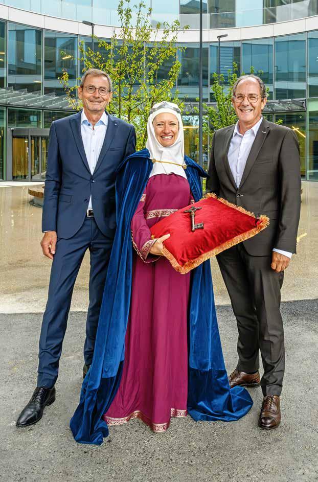 «Königin Agnes» überreicht im Herbst 2024 dem VR-Präsidenten Dr. Daniel Heller (links) und KSB-CEO Adrian Schmitter symbolisch den Schlüssel für den Neubau. Im Gebäude läuft derweil die Testphase.