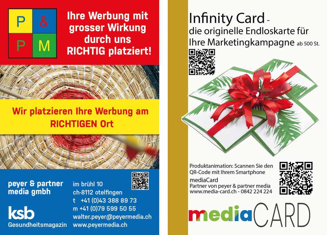 Impressum: Herausgegeben von der Kantonsspital Baden AG. Erscheint viermal jährlich | Redaktionsadresse: Redact Kommunikation AG, Europa-Strasse 17, 8152 Glattbrugg, redaktion@ksb.ch | Redaktionsleitung: Nicole Urweider; Gestaltung: Dana Berkovits, Jacqueline Müller, Christoph Schiess | Anzeigenmarketing: Walter Peyer, T 043 388 89 73, walter.peyer@peyermedia.ch | Druck: Vogt-Schild Druck AG, Gutenbergstrasse 1, 4552 Derendingen.