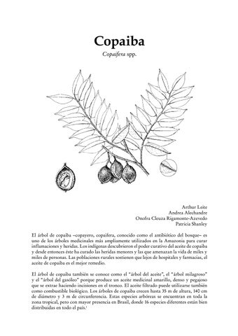 Arthur Leite Andrea Alechandre Onofra Cleuza Rigamonte-Azevedo Patricia Shanley El árbol de copaiba –copayero, copaifera, conocido como el antibiótico del bosque– es uno de los árboles medicinales más ampliamente utilizados en la Amazonia para curar inflamaciones y heridas. Los indígenas descubrieron el poder curativo del aceite de copaiba y desde entonces éste ha curado las heridas menores y las que amenazan la vida de miles y miles de personas. Las poblaciones rurales sostienen que lejos de hospitales y farmacias, el aceite de copaiba es el mejor remedio. El árbol de copaiba también se conoce como el “árbol del aceite”, el “árbol milagroso” y el “árbol del gasóleo” porque produce un aceite medicinal amarillo, denso y pegajoso que se extrae haciendo incisiones en el tronco. El aceite filtrado puede utilizarse también como combustible biológico. Los árboles de copaiba crecen hasta 35 m de altura, 140 cm de diámetro y 3 m de circunferencia. Estas especies arbóreas se encuentran en toda la zona tropical, pero con mayor presencia en Brasil, donde 16 especies diferentes están bien distribuidas en todo el país.1