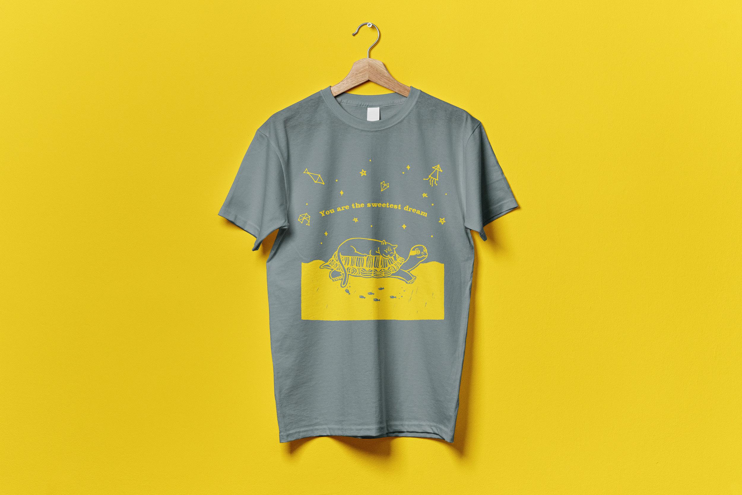 於2022年參與 Retro 印刷 JAM 舉辦的「SURIMACCA 絹印サミット 短袖篇」絹 印體驗活動,聚集來自日本、台灣創作者設計的250款絹印圖案,本次以台灣區創 作者身分參加;創作靈感來自我的寵物們,丹娃(龜)與麥香(貓),平常總是 在水盆外看著丹娃的麥香,和丹娃相約在夢裡一起到寧靜的大海悠遊,抬頭仰望 星象有鮮魚、蝦仁、魷魚,看來今晚可以一起來一頓海鮮大餐。