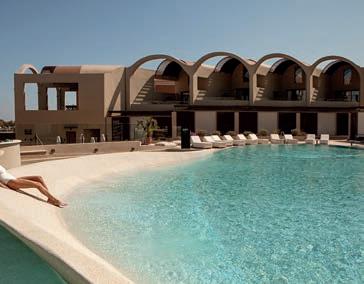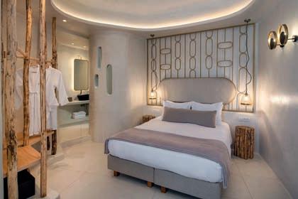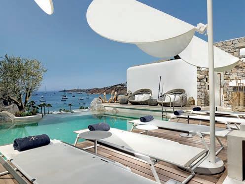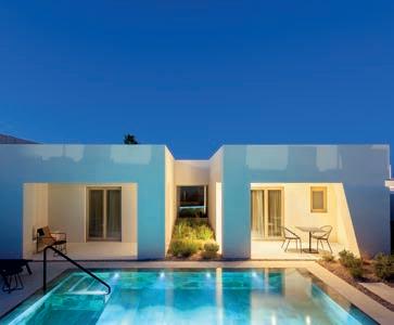 for their pure minimalism. Kenshō Ornos respects the values of Mykonian architec ture. Nestled in the island’s relief it is fully integrated in the landscape, recalling memories of tradition. The colour palette used, the materials and their textures are all rooted in the his tory of Mykonos. At the same time state-of-the-art technology and original design icons coexist creating a contemporary and serene personal haven where our guests can truly relax. In your room, or in the common areas of the hotel, you will find iconic design object by: Gervasoni