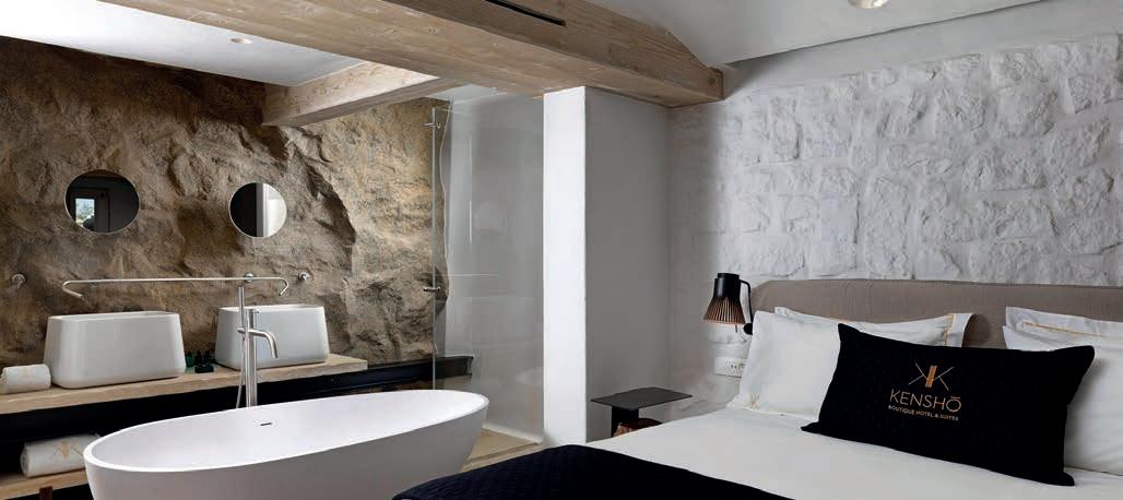 Kenshō means enlightenment in Japanese. Ken means see and shō means in nature. So, I would say that Kenshō is all about getting in touch with all your senses and nature. That is why all the material being used in the hotel are natural, like wood and natural stone which coming from Mykonos. Kenshō is a design boutique hotel, firstly, because it as pires the boutique hotel philosophy and every room’s design and decoration are unique, and secondly because all the furniture and the lighting are by famous designers such as Paola Navone, Claudio Bellini, Tom Dixon. Under the bright sun of Mykonos, a unique architectural style was born. Authentic, simple, and timeless, Mykonian archi tecture leaves no room for anything superfluous or unneces sary. With stone and natural wood being its main tools, it has given shape to settlements that are known all over the world